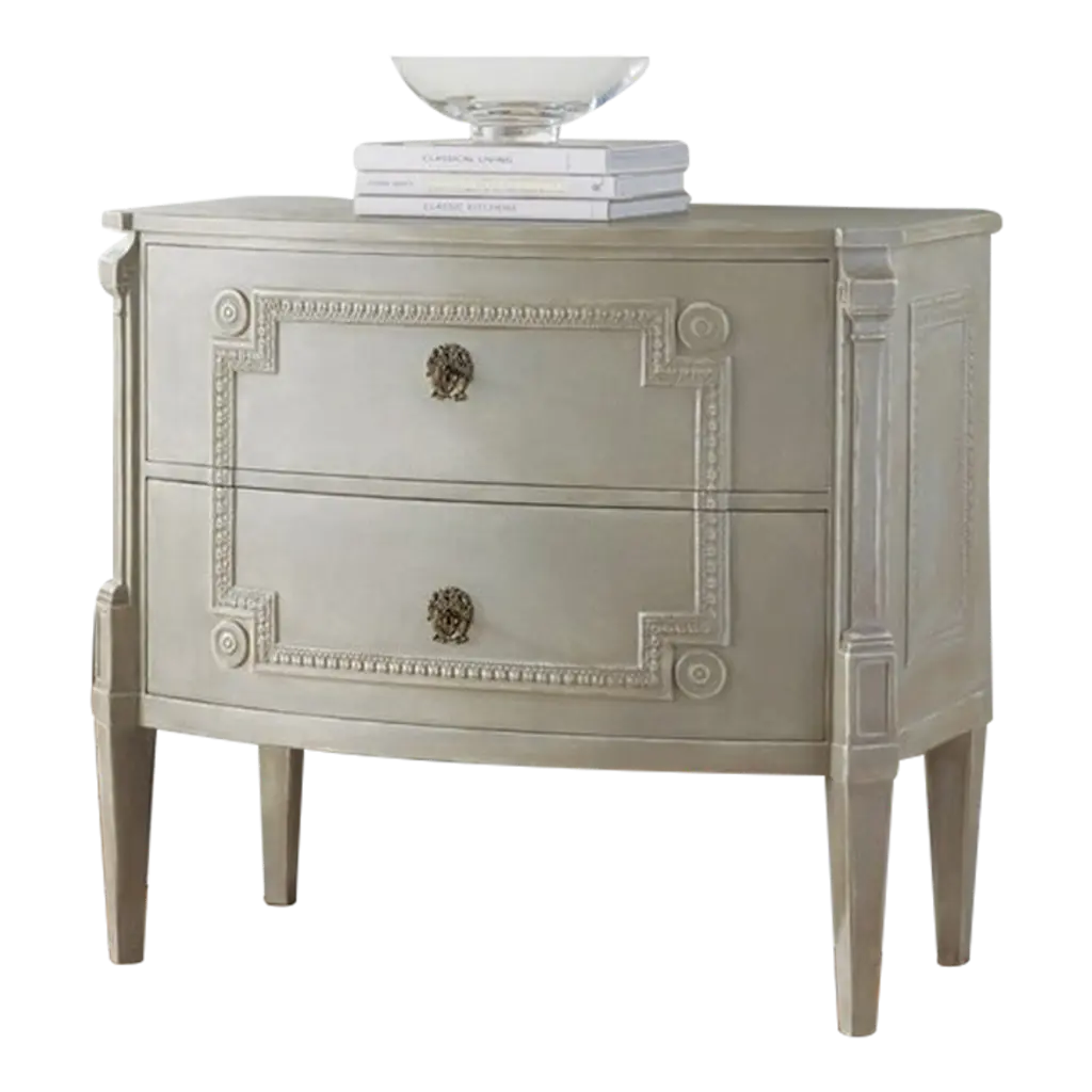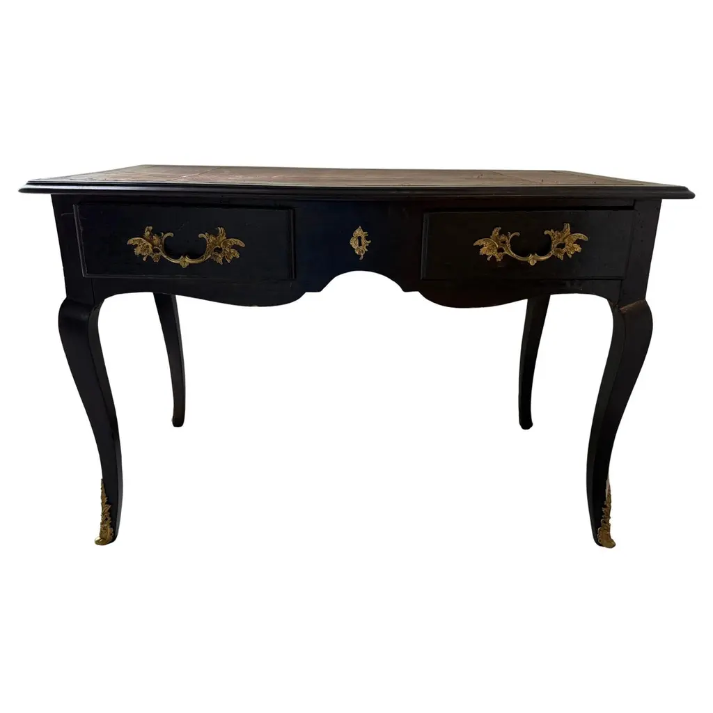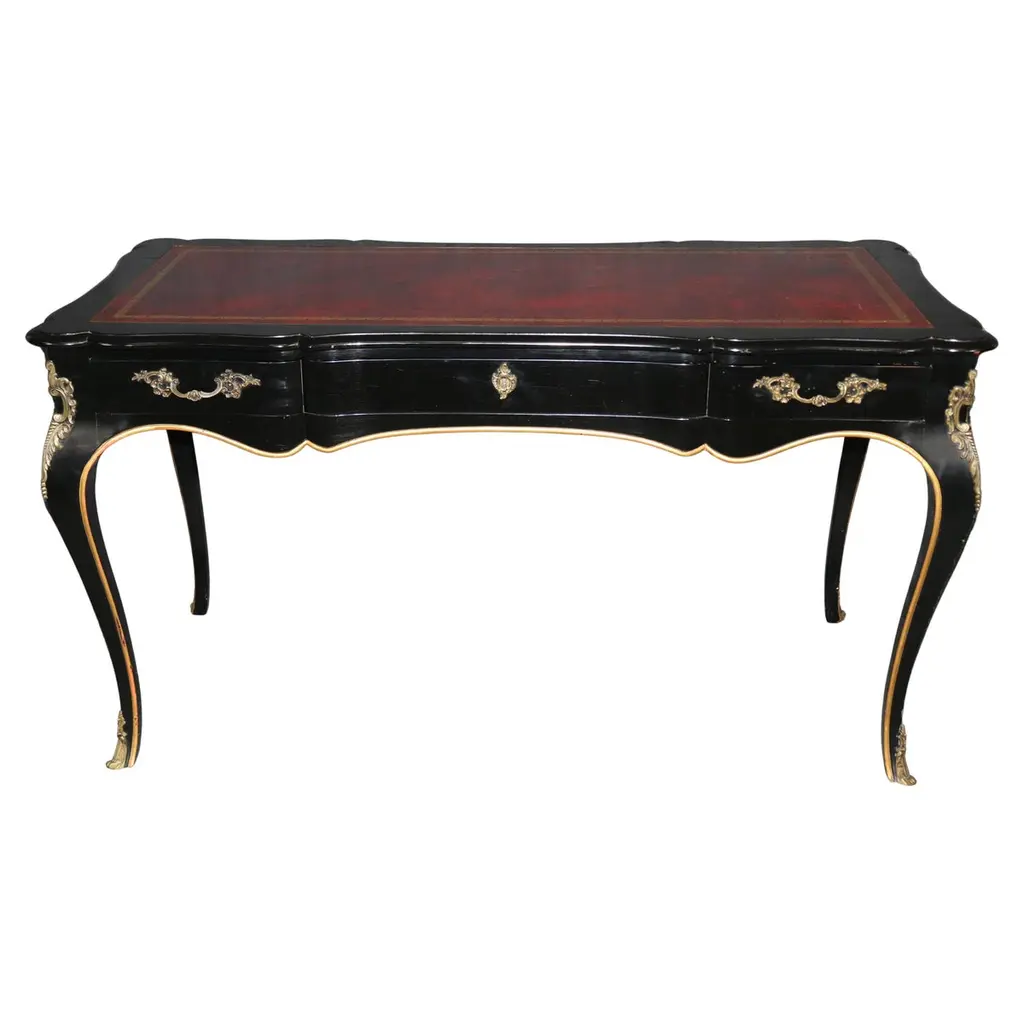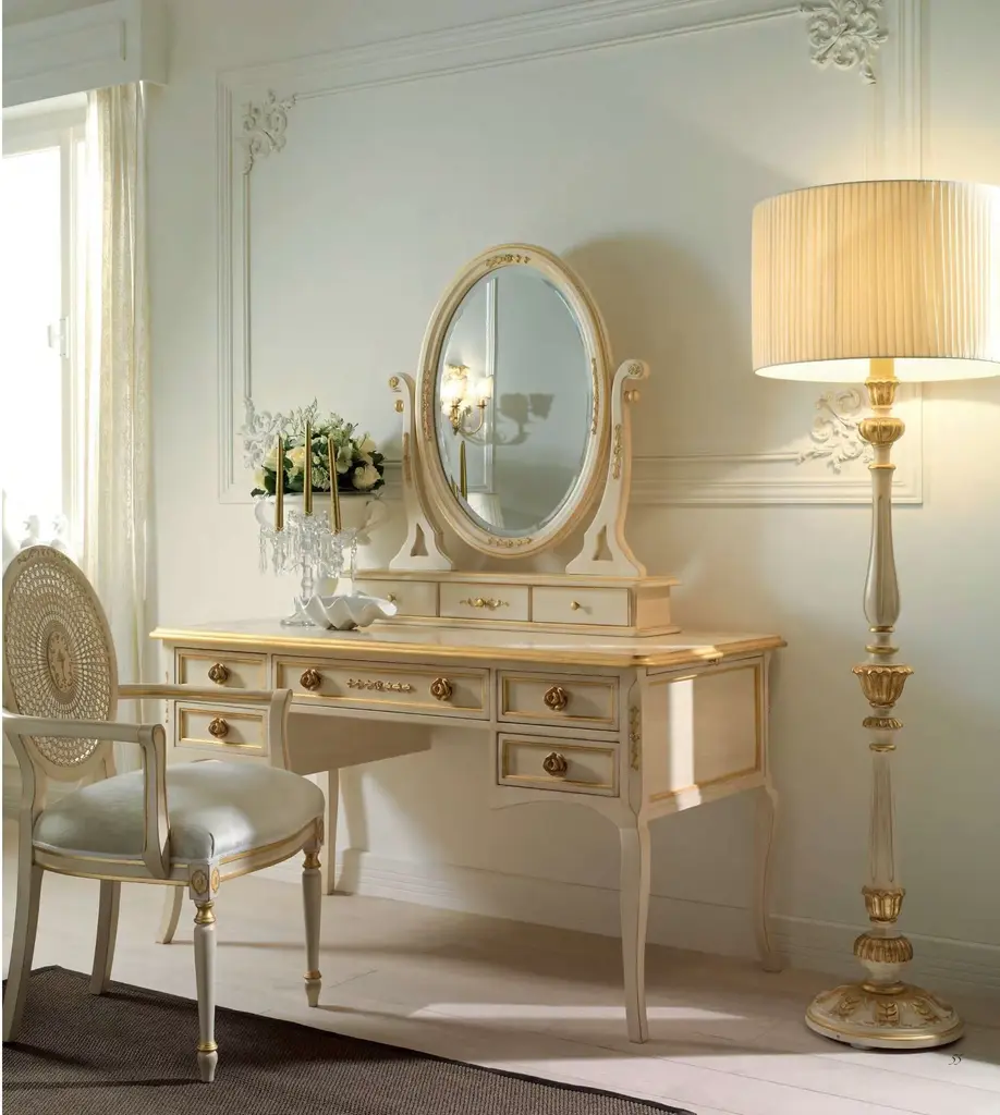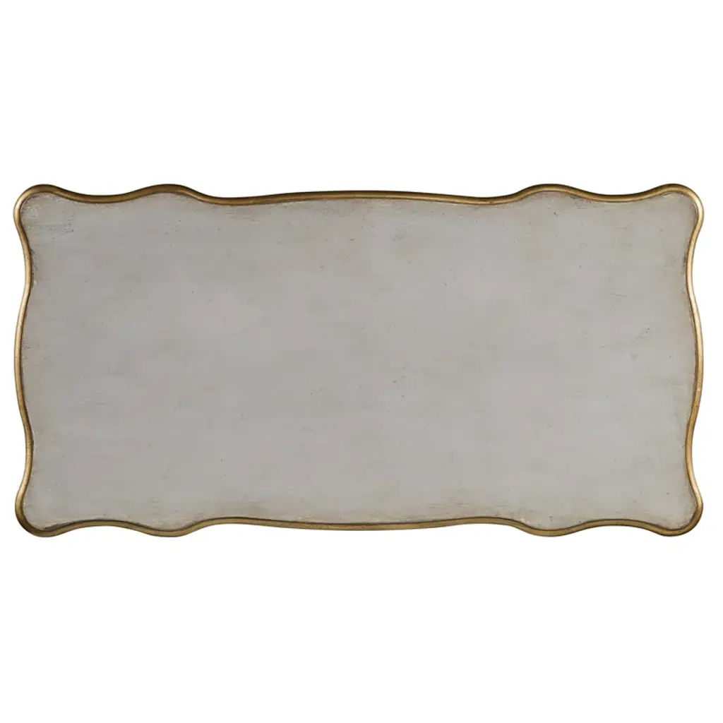 French-style lovers can create a romantic work-from-home solution with this exquisite desk in a soft gray finish with gold accents, a shapely apron and cabriole legs, and gold medallion hardware. In an efficient 54-inch width, the desk features a center drawer with a drop-front for keyboard use, 2 utility drawers with one removable writing insert, and a pencil tray with a felt bottom for use in either drawer and 2 removable dividers in each drawer. Crafted using hardwood solids this magnificent desk features a center drawer with a drop-front for keyboard use and two utility drawers with one removable writing insert and a pencil tray with felt bottom for use in either drawer, two removable dividers in each drawer.