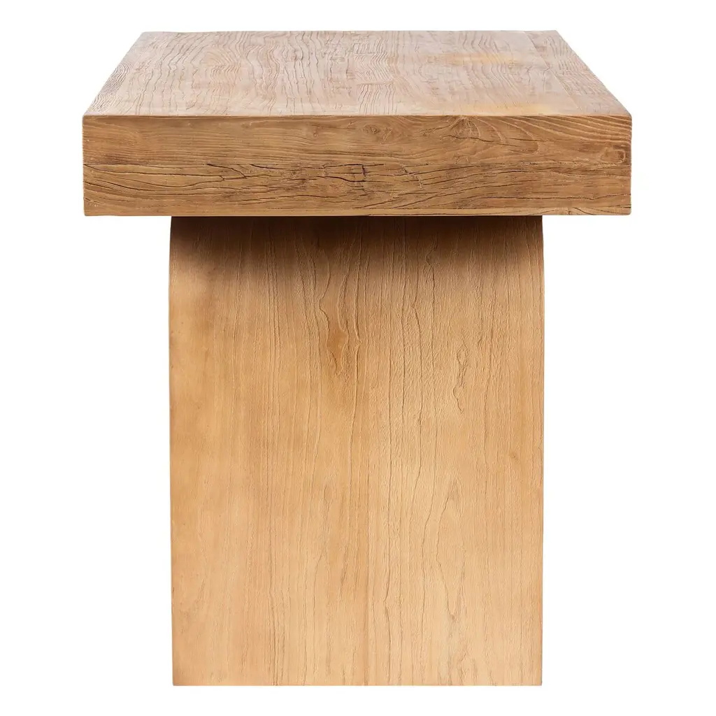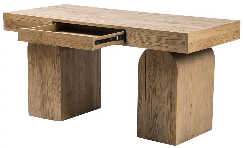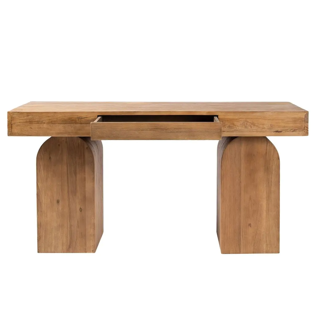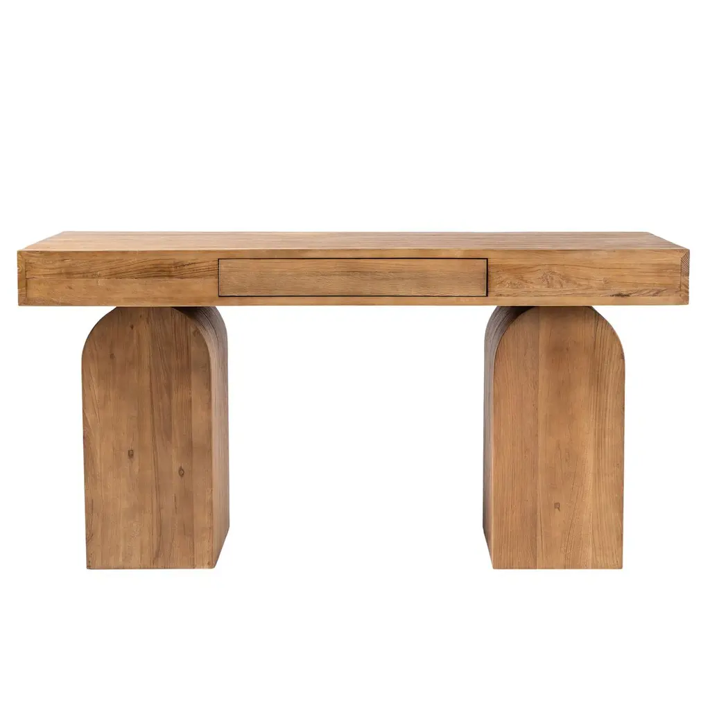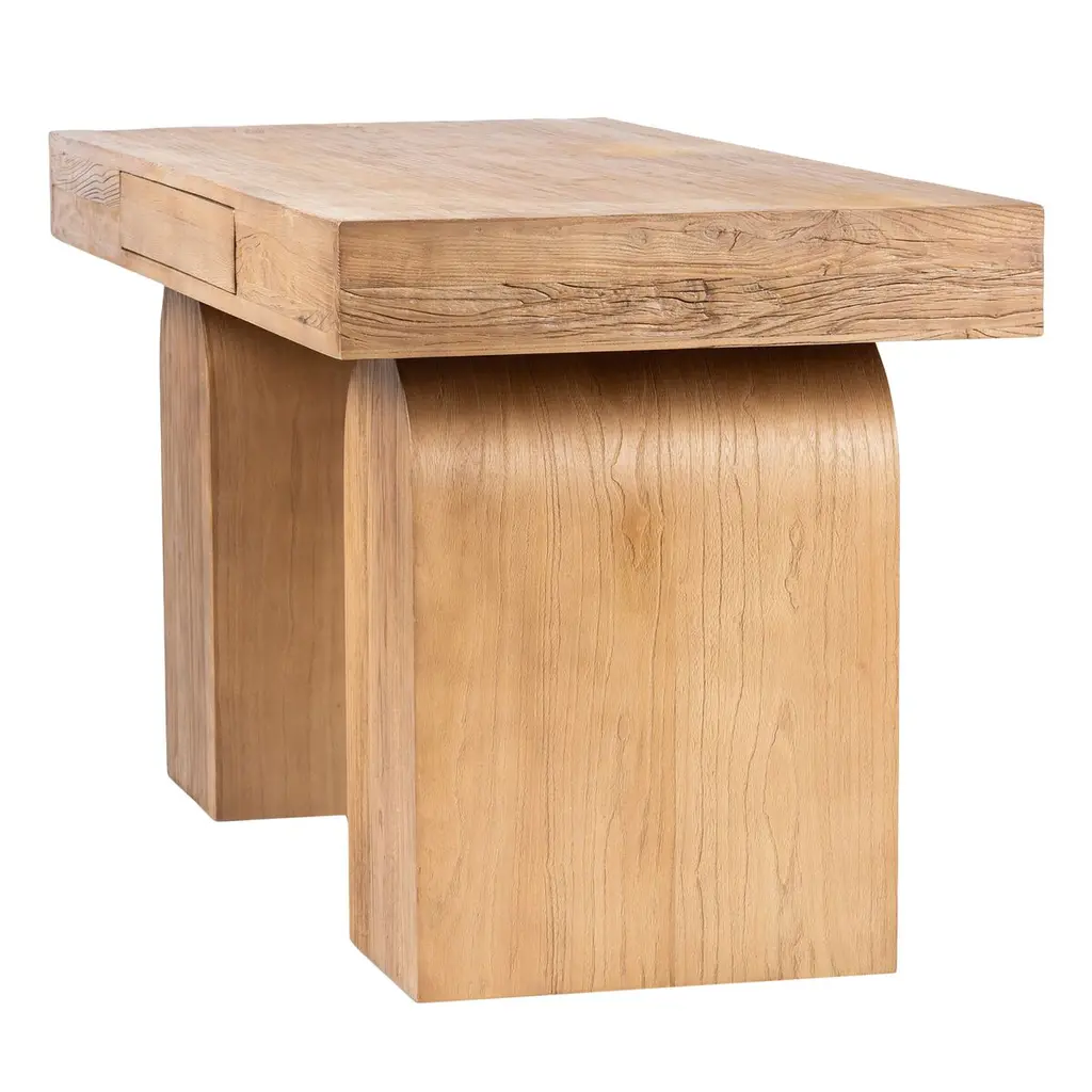 Handcrafted of reclaimed elm, this sculptural desk shows off its unique grain and knots with pride. Striking enough to serve as a console table in an entry or a living room, it has a drawer where you can stash items out of sight.