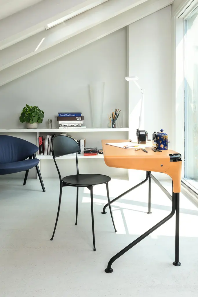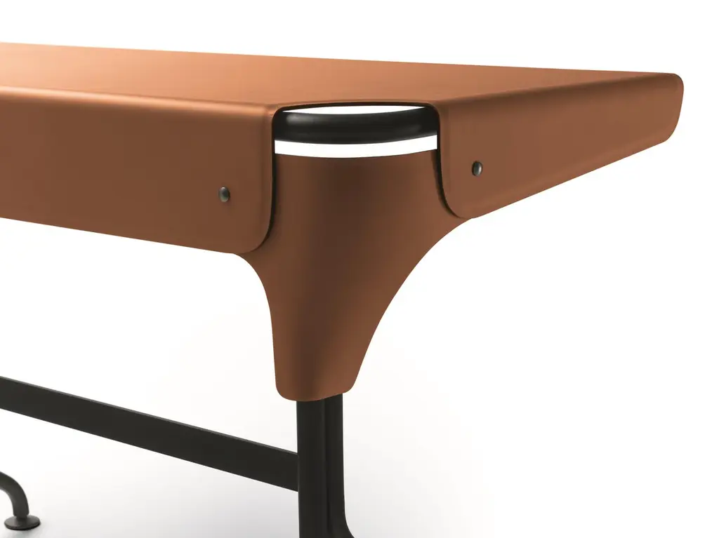 Zanotta Tucano Writing Desk in 0814 Cowhide Pigmentato Top with Matt Black FrameMatt black varnished steel frame. Top covered with cowhide pigmentato 90.A discreet, elegant, sculptural desk, an expression of refined simplicity and design synthesis. Attention to detail can be found in the visible rivets placed on the corner joints and in the new way of processing the leather whereby the thickness is tapered to create a depression that runs along the entire perimeter of the surface top. Leather, an ancient material, precious and at the same time raw, contemporary and timeless. The matte black tubular steel structure draws a continuous profile and creates the support for the thin top, made with a single piece of leather that rests on the structure, leaving only some parts uncovered. A functional and refined desk in durable and quality materials: an ideal work companion for the home environment and for hospitality.Additional Information:Material: Varnished steel, cowhide pigmentatoTop finish: 0814 BrownFrame finish: Matt black varnished steelDimension: 115 W x 52 D x 74 H cmAvailable in other Top finish options