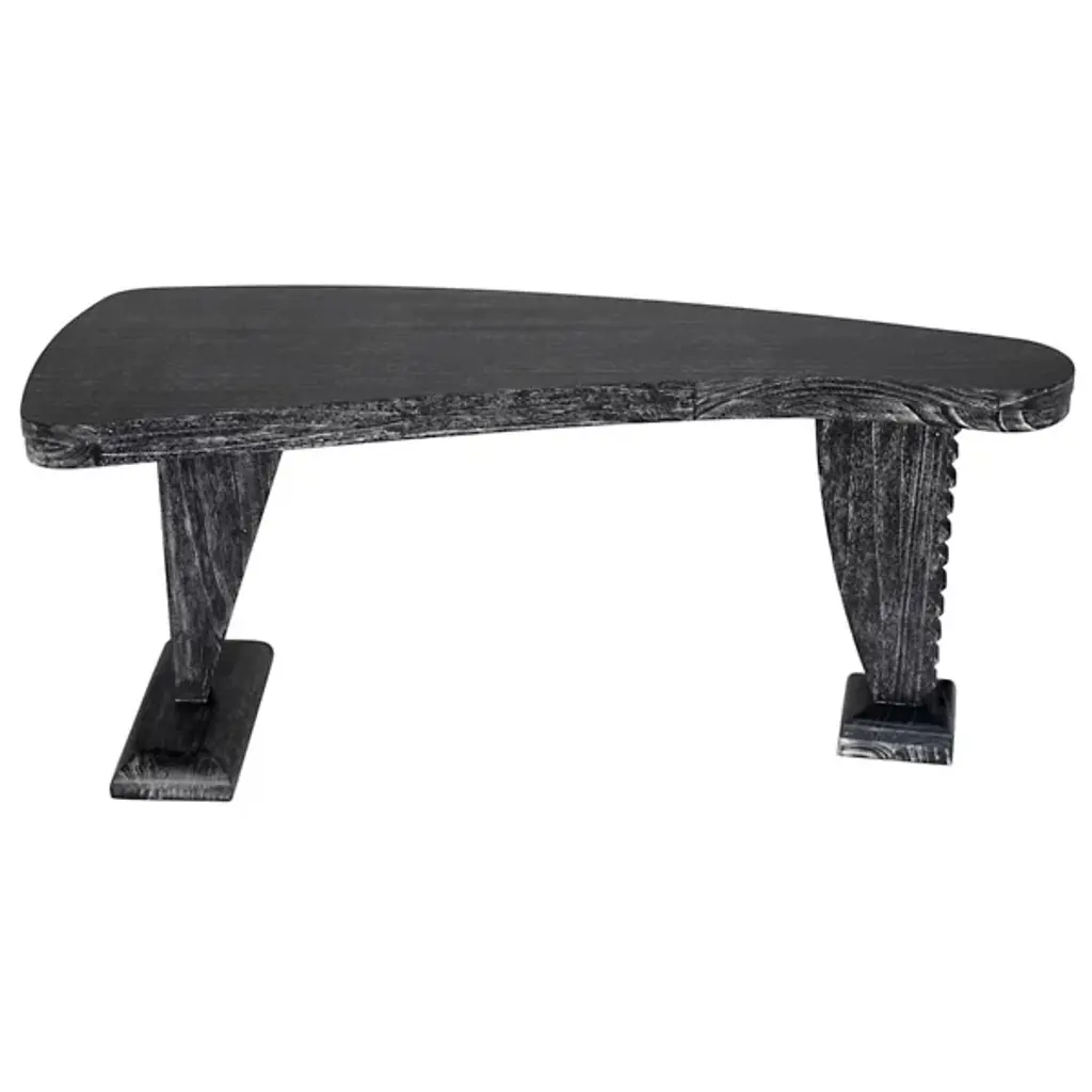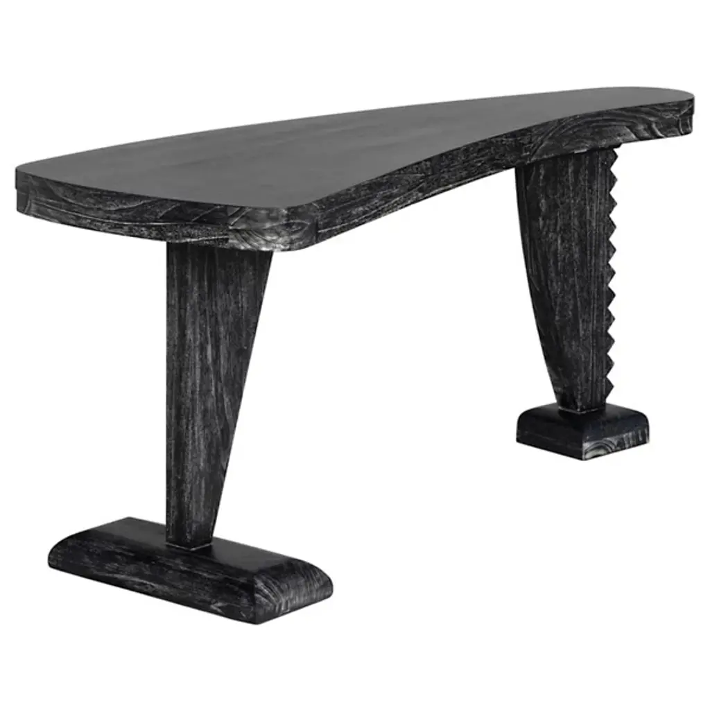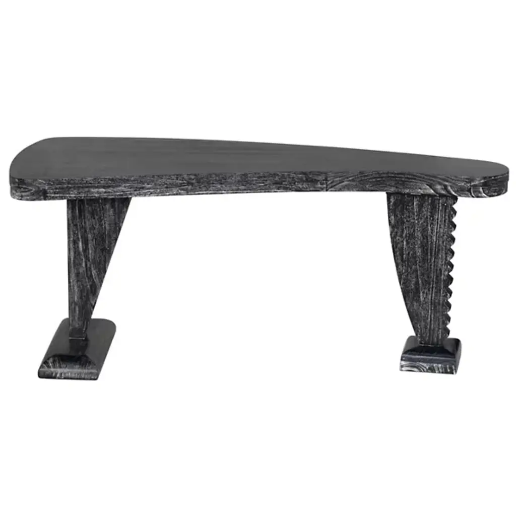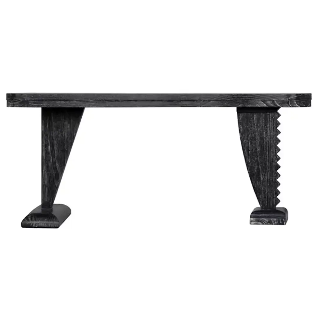 The Zigmund Desk from Noir features a dramatic cinder black finish that envelops the mahogany in smoky, sophisticated tones across its working surface. The dark treatment creates impressive depth while allowing subtle grain patterns to emerge beneath the rich coating throughout. Clean rectangular lines emphasize the wood's substantial construction and natural heft in every detail of the piece. This desk demonstrates how bold finish choices can completely alter a material's character and presence in any modern workspace environment.
