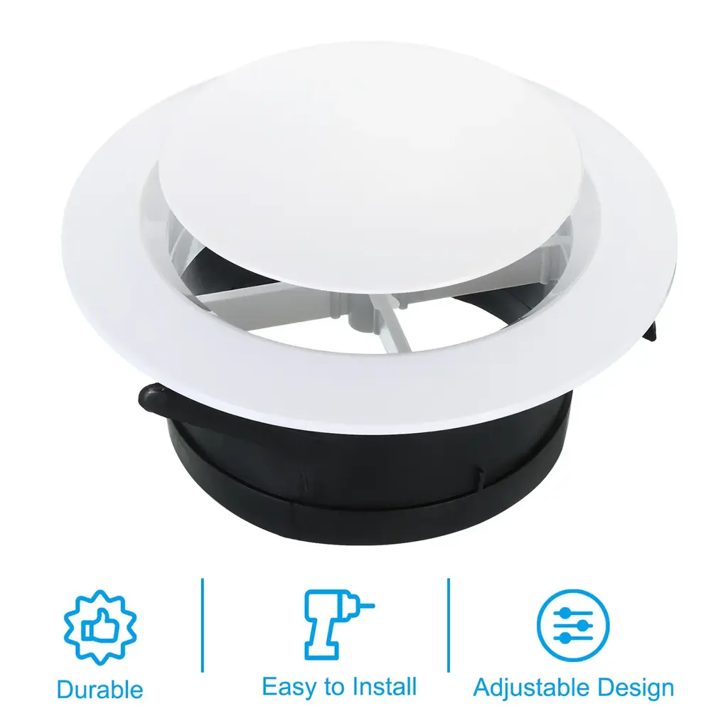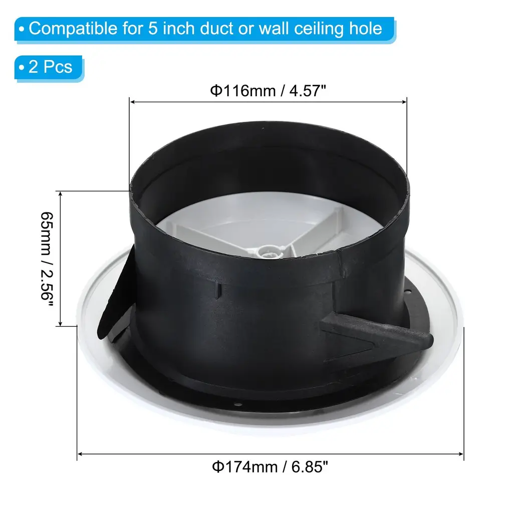 These versatile vent covers are suitable for various spaces. Use them in your living room to maintain a comfortable airflow, in your closet to prevent dust accumulation, in your bathroom to control ventilation, or in your kitchen to enhance air spreading. Their decorative design adds a touch of elegance to any room.SpecificationMaterial: ABS PlasticColor: WhiteDiameter: 174mm / 6.85 inchHeight: 65mm / 2.56 inchOpening Dia.: 116mm / 4.57 inchCompatible for 5 inch duct or wall ceiling holePacking List: 2 x Round Air VentAdvantageExperience the advantages of our Round Air Vent Covers. With their adjustable air volume feature, you have full control over the airflow in your space. Crafted from ABS plastic material, these covers are built to withstand regular use. InstructionThe detachable design makes them easy to clean and maintain. Additionally, it is simple to install. Simply position the round air cover over the hole in the wall ceiling or your duct, and it will securely attach with its black wings on the bottom.NOTE: Before purchasing, ensure the size of the hole on the wall and ceiling or your duct matches our air vent cover. Keep the vent covers away from direct heat sources to prevent any damage. Regularly inspect and clean the covers to maintain optimal performance.