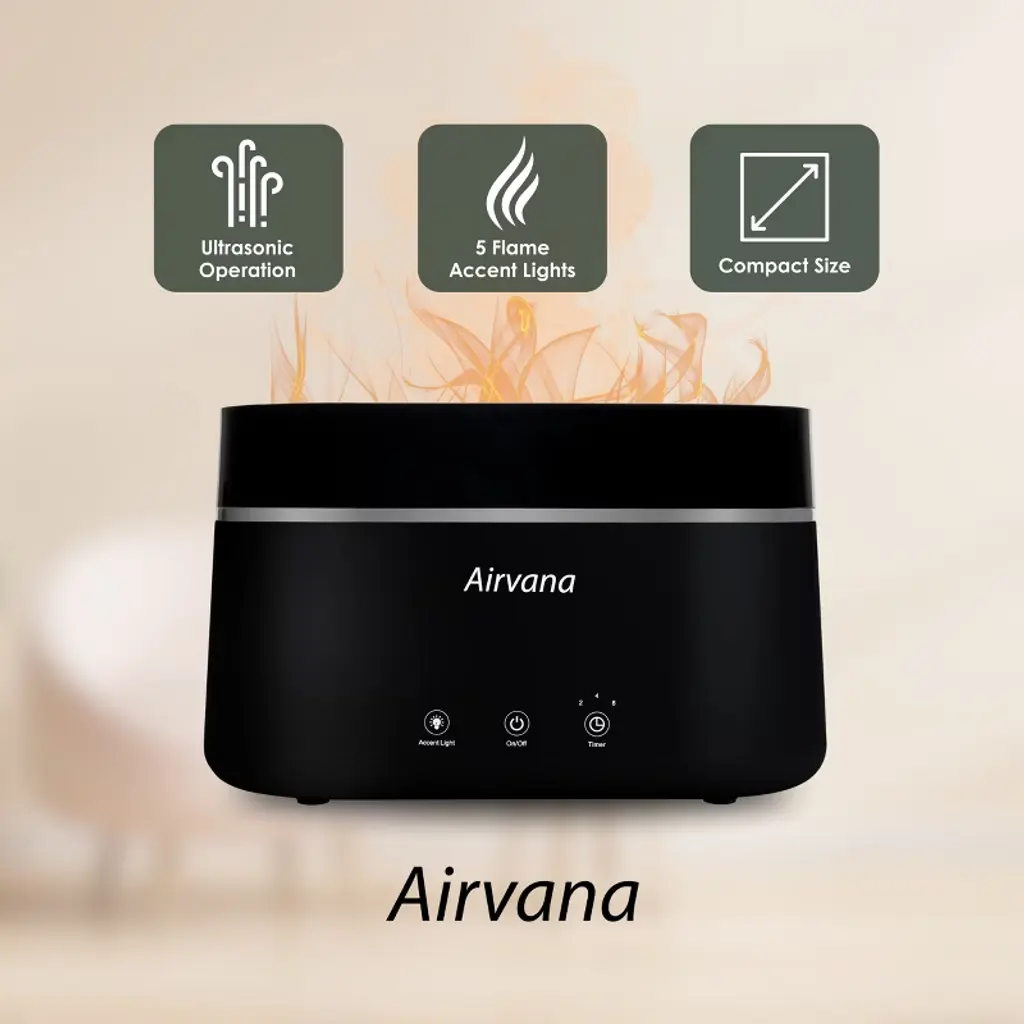 Elevate Your Space with the Airvana AquaFlame AV300HUM – A Stylish Cool Mist Humidifier for Wellness and Ambiance Experience the perfect fusion of functionality and style with the Airvana AquaFlame AV300HUM Cool Mist Humidifier. Designed for modern living, this small humidifier features ultrasonic vibration technology for efficient moisture delivery, making it ideal for home offices, dorm essentials, and apartment essentials. Its sleek tabletop design fits seamlessly into any room, while the captivating flame effect and mood-matching colors add a personalized touch to your space. Compatible with essential oils, it doubles as a relaxing diffuser and a plant humidifier for indoor greenery. With a convenient top-fill tank and built-in timer, this unit offers hassle-free operation and stylish comfort wherever you need it.