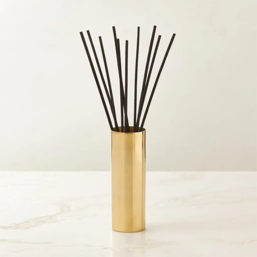 Joya and CB2 partnered to create a reed diffuser with notes of cognac and sage. Fine fragrance oil is poured into a reusable vessel crafted of unlacquered brass, offering a living finish that will develop the patina of a vintage find. Simply polish the brass to bring back its original luster. Scent designed by Joya, a chic fragrance studio based in a 19th-century Brooklyn rigging garage. CB2 exclusive.