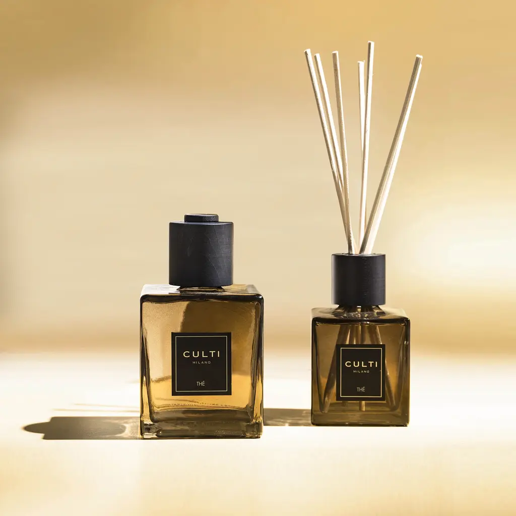 The sculpted, square-shaped bottle in thick glass with dark brown maple wood cap are the bold, distinct features of the CULTI MILANO DECOR line, which add a touch of character to any room. This evokes relaxation and serenity just like soaking in the meditative warmth of a bath tub filled with Japanese green tea. Envision the vapors rising hypnotically off the water, delicately diffusing and filling the room with the aroma of tea leaves.
