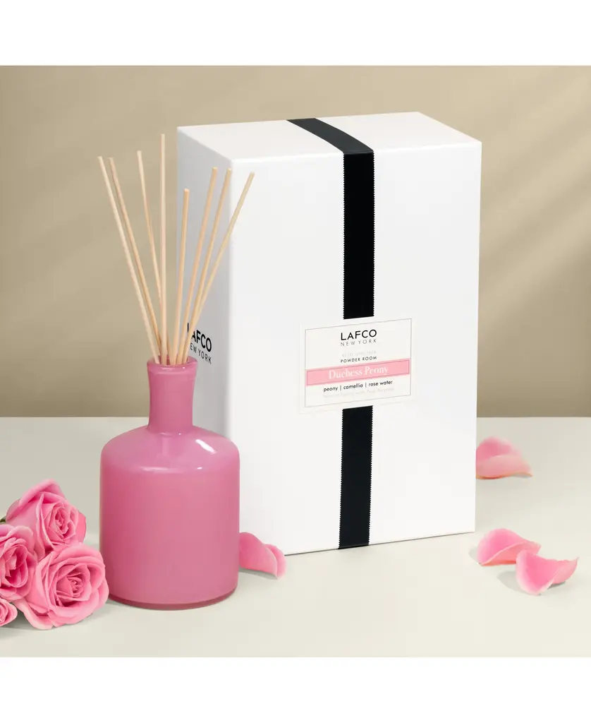 Sweeten any setting with the romantic scent of LAFCO's diffuser, featuring an aromatic blend of fully bloomed peonies, camellia blossoms and cassis.