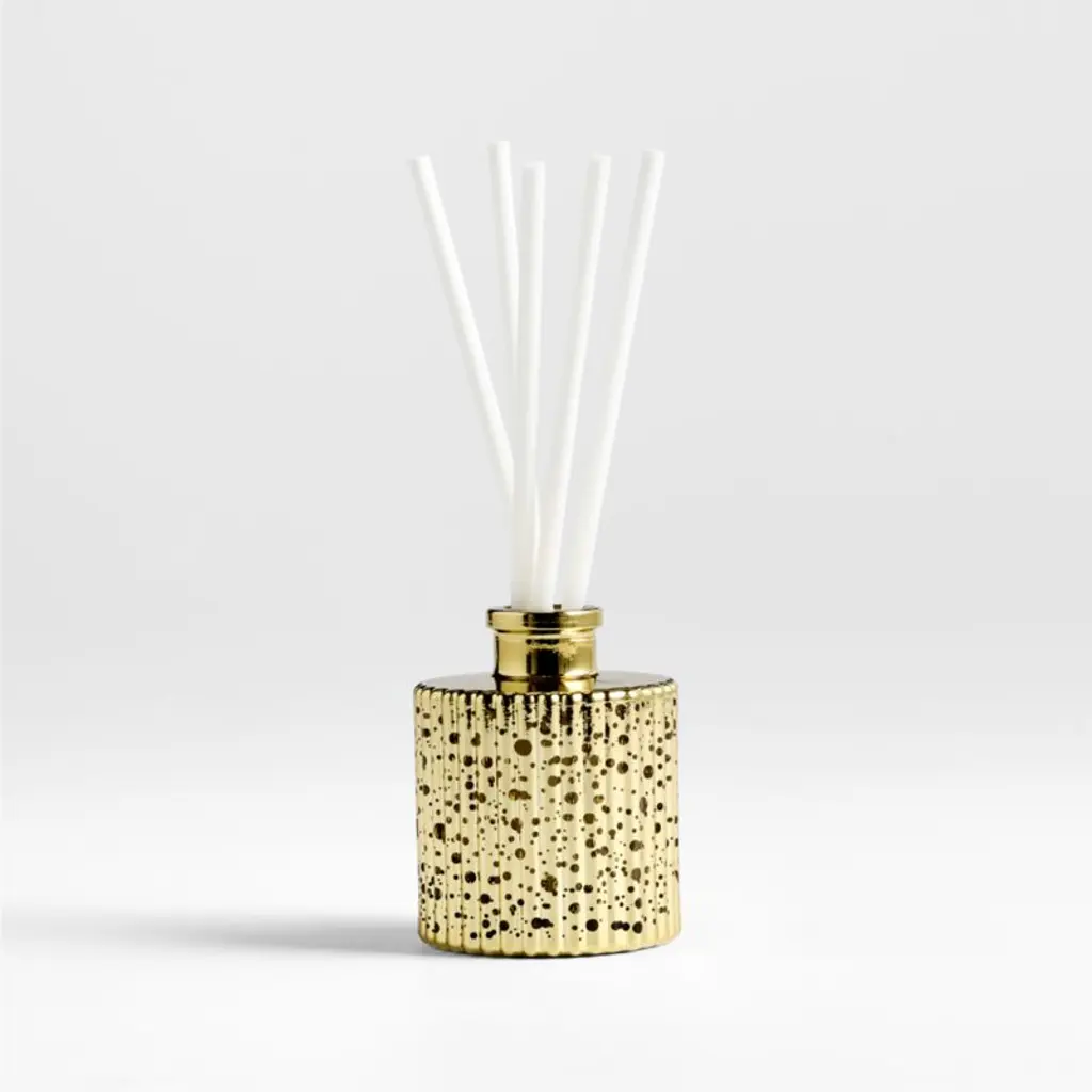 Fete the holiday season with lovely scents and golden dazzle. Inspired by our exclusive Atwell drinkware, the fluted diffuser takes on extra sparkle with a bronze-gold mercury glass finish. Rattan reeds absorb the eucalyptus and amber-scented oil, releasing the woodsy aroma into the air. To refresh the fragrance, simply jiggle the reeds, or take them out and put them back in upside down. Packaged in a gift box with festive, metallic-enhanced graphics, our diffuser makes a lovely gift.