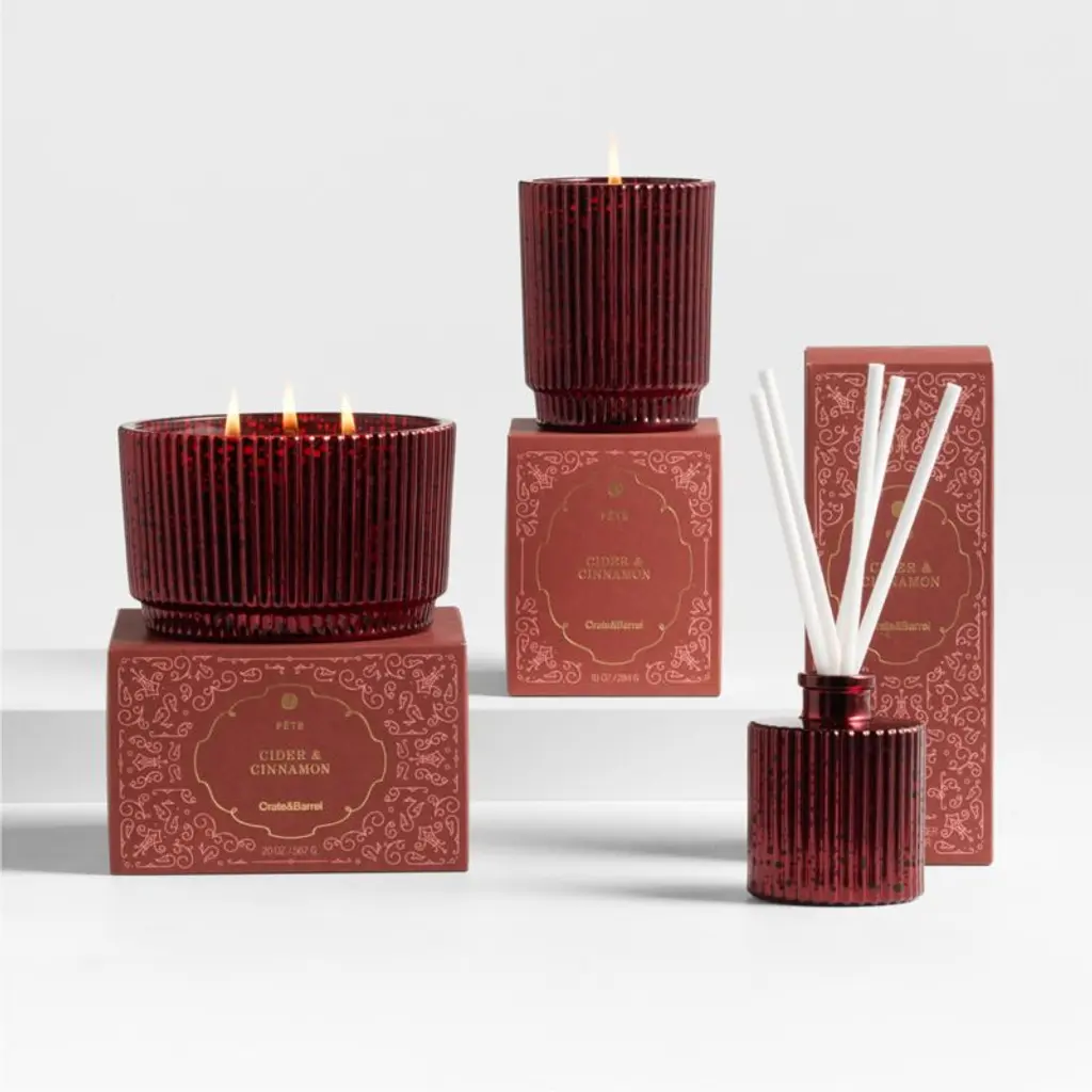 Fete the holiday season with lovely scents and wintery dazzle. Inspired by our exclusive Atwell drinkware, the fluted diffuser takes on extra sparkle with a red mercury glass finish. Rattan reeds absorb the orange- and cinnamon-scented oil, releasing the warm, spicy aroma into the air. To refresh the fragrance, simply jiggle the reeds, or take them out and put them back in upside down. Packaged in a gift box with festive, metallic-enhanced graphics, our diffuser makes a lovely gift.