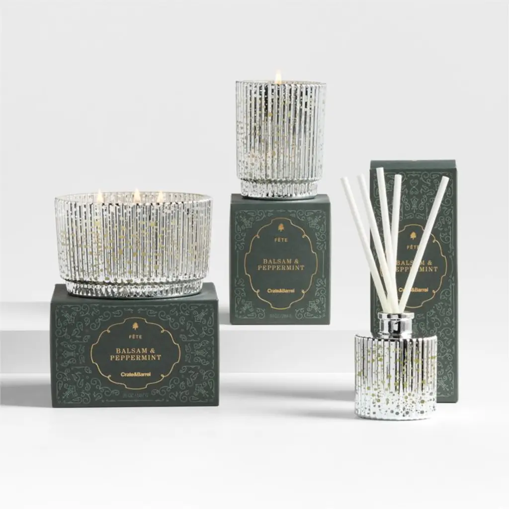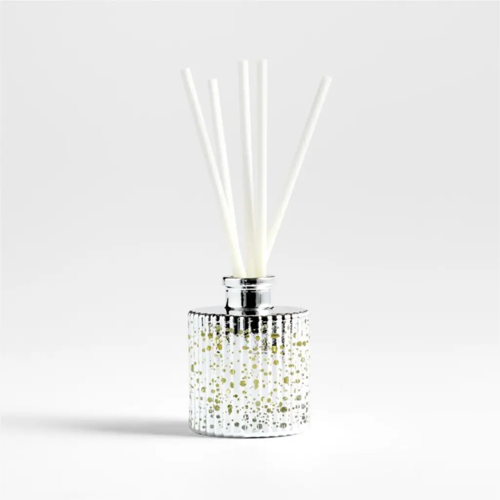 Fete the holiday season with lovely scents and silver dazzle. Inspired by our exclusive Atwell drinkware, the fluted diffuser takes on extra sparkle with a silvery mercury glass finish. Rattan reeds absorb the balsam- and peppermint-scented oil, releasing the alpine aroma into the air. To refresh the fragrance, simply jiggle the reeds, or take them out and put them back in upside down. Packaged in a gift box with festive, metallic-enhanced graphics, our diffuser makes a lovely gift.