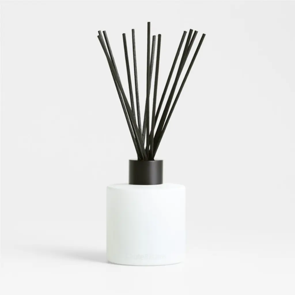 Fill your kitchen with the spicy floral fragrances of geranium and bergamot. Our exclusive diffuser provides a fresh, clean aroma of jasmine, geranium leaf, star anise, parsley and peach against a backdrop of zesty citrus. Echoing the enticing smells of baking and cooking, our kitchen scent collection features plant-based formulas with deliciously fragrant combinations of essential oils. The diffuser's black rattan reeds absorb the oil and release it gradually for the ideal level of scent. To refresh the fragrance, simply jostle the reeds gently, or take them out and put them back in upside-down. Our signature black-and-white design looks crisp and modern on the counter.View all "The Kitchen by Crate" collection