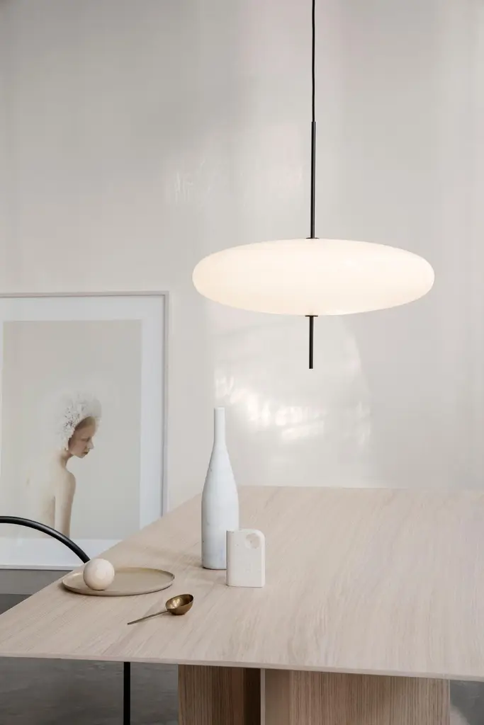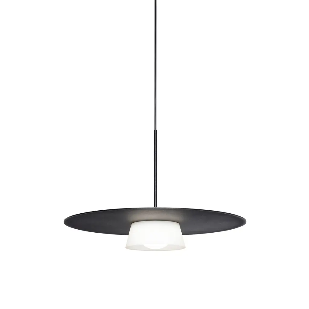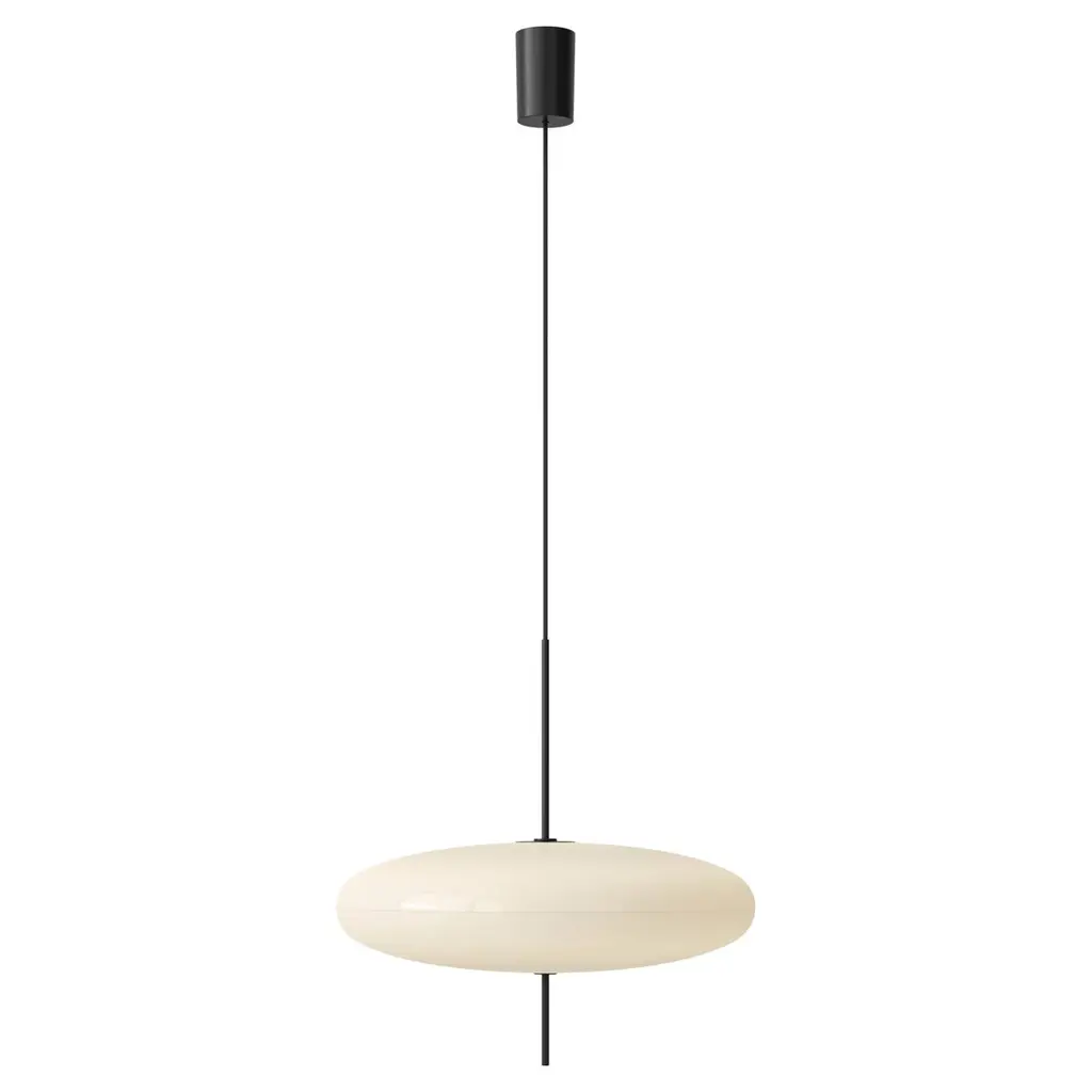 Gino Sarfatti lamp model 2065.White diffuser, black hardware, white cable.Manufactured by AstepModel 2065Design by Gino SarfattiThe 2065 is made of two joined opaline methacrylate saucer-shaped diffusers suspended from the ceiling with a black painted aluminum canopy.The simplicity of the design and lightness of the materials makes for an elegant and free-floating Luminaire.Timeless Innovation 1950-2016The suspension lamp designed in 1950 emphasizes the innovative, experimental approach of Gino Sarfatti. At that time, the favored material of the lighting industry was glass. But when Gino Sarfatti received the first samples of methacrylate in 1949-1950, a new polymer plastic that was much stronger and lighter than glass, his experiments led him to a new suspension lamp, Model 2065. As in so many of his designs, he continued to work with different compositions, dimensions and color variants over the following years.Model 2065 consists of a diffuser made of two joined opalescent saucers, suspended from the ceiling with a black-painted aluminum canopy. The simplicity of Gino Sarfatti’s elliptical design and the lightness of the materials make for a seemingly weightless Luminaire.The Luminaire was relaunched by Astep in 2016, which also introduced a black version where the upper saucer is finished with a soft-touch coating. This leaves the lower diffuser as the only light source, creating a more intimate light space and a strong, graphic expression. In a continuation of the original IDEA, five LED bulbs provide the lighting in both versions.Specifications model 2065Typology suspensionMaterials opaline methacrylate diffusers, aluminum structureDimensions: Ø 538 x 546mmDiffuser diameter Ø 538mmCable length 4000mmWeight 2.70kgLight source 5 x E14 LED 4.5W470lm (2350lm Total)2700KDimmable bulbs includedNot UL listed.This lamp is wired for Europe, if used in US or any other country the client will need to convert it.Gino SarfattiBorn in Venice in 1912, Gino Sarfatti studied to become an aeronautical engineer until family circumstances compelled him to relocate to Milan where he had his first encounter with lighting, an engineering project to transform a glass vase into a lamp. This encounter with lighting design and engineering shaped the path of his life. In 1939 Gino Sarfatti founded his company Arteluce, which brought lighting into the 20th century combining innovative ideas with groundbreaking design.Arteluce won numerous prizes and awards including the Compasso d’Oro in 1954 and 1955, and the Honorary Diploma of the Milan Triennale, becoming an important meeting place for many leading Italian architects throughout the 1950s and 1960s. The first Milanese Arteluce retail space was designed with Marco Zanuso in 1951. Ten years later Gino Sarfatti and his lifelong friend Vittoriano Viganò designed their flagship location on Via Della Spiga.Throughout his career, Gino Sarfatti explored and was inspired by new product typologies, innovative materials, lighting technologies, and production techniques. His hybrid talent as a designer and engineer enabled him to created refined products in both aesthetics and function.Gino Sarfatti was a significant figure in the history of Italian Industrial Design, developing more than 700 luminaires. In 1973 he retired on Lake Como, with Flos acquiring Arteluce and their expansive catalog.Gino Sarfatti died at Gravedona in 1985.