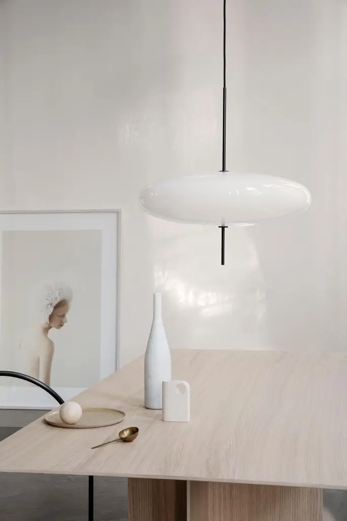 Gino Sarfatti lamp model 2065.White diffuser, black hardware, white cable.Manufactured by AstepModel 2065Design by Gino SarfattiThe 2065 is made of two joined opaline methacrylate saucer-shaped diffusers suspended from the ceiling with a black painted aluminum canopy.The simplicity of the design and lightness of the materials makes for an elegant and free-floating Luminaire.Timeless Innovation 1950-2016The suspension lamp designed in 1950 emphasizes the innovative, experimental approach of Gino Sarfatti. At that time, the favored material of the lighting industry was glass. But when Gino Sarfatti received the first samples of methacrylate in 1949-1950, a new polymer plastic that was much stronger and lighter than glass, his experiments led him to a new suspension lamp, Model 2065. As in so many of his designs, he continued to work with different compositions, dimensions and color variants over the following years.Model 2065 consists of a diffuser made of two joined opalescent saucers, suspended from the ceiling with a black-painted aluminum canopy. The simplicity of Gino Sarfatti’s elliptical design and the lightness of the materials make for a seemingly weightless Luminaire.The Luminaire was relaunched by Astep in 2016, which also introduced a black version where the upper saucer is finished with a soft-touch coating. This leaves the lower diffuser as the only light source, creating a more intimate light space and a strong, graphic expression. In a continuation of the original IDEA, five LED bulbs provide the lighting in both versions.Specifications model 2065Typology suspensionMaterials opaline methacrylate diffusers, aluminum structureDimensions: Ø 538 x 546mmDiffuser diameter Ø 538mmCable length 4000mmWeight 2.70kgLight source 5 x E14 LED 4.5W470lm (2350lm Total)2700KDimmable bulbs includedNot UL listed.This lamp is wired for Europe, if used in US or any other country the client will need to convert it.Gino SarfattiBorn in Venice in 1912, Gino Sarfatti studied to become an aeronautical engineer until family circumstances compelled him to relocate to Milan where he had his first encounter with lighting, an engineering project to transform a glass vase into a lamp. This encounter with lighting design and engineering shaped the path of his life. In 1939 Gino Sarfatti founded his company Arteluce, which brought lighting into the 20th century combining innovative ideas with groundbreaking design.Arteluce won numerous prizes and awards including the Compasso d’Oro in 1954 and 1955, and the Honorary Diploma of the Milan Triennale, becoming an important meeting place for many leading Italian architects throughout the 1950s and 1960s. The first Milanese Arteluce retail space was designed with Marco Zanuso in 1951. Ten years later Gino Sarfatti and his lifelong friend Vittoriano Viganò designed their flagship location on Via Della Spiga.Throughout his career, Gino Sarfatti explored and was inspired by new product typologies, innovative materials, lighting technologies, and production techniques. His hybrid talent as a designer and engineer enabled him to created refined products in both aesthetics and function.Gino Sarfatti was a significant figure in the history of Italian Industrial Design, developing more than 700 luminaires. In 1973 he retired on Lake Como, with Flos acquiring Arteluce and their expansive catalog.Gino Sarfatti died at Gravedona in 1985.