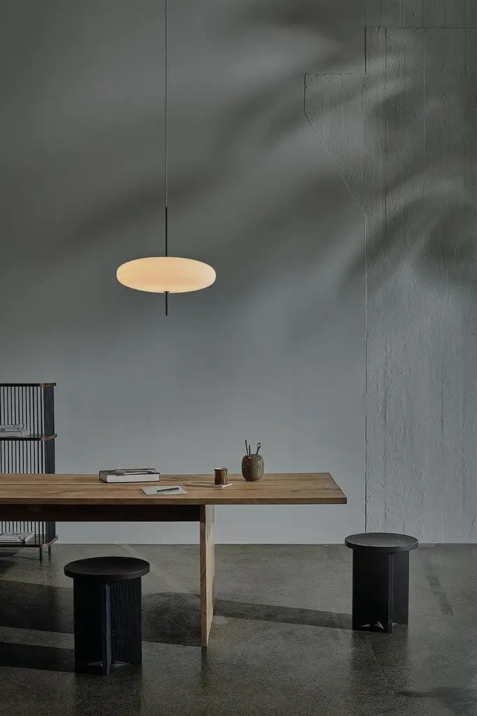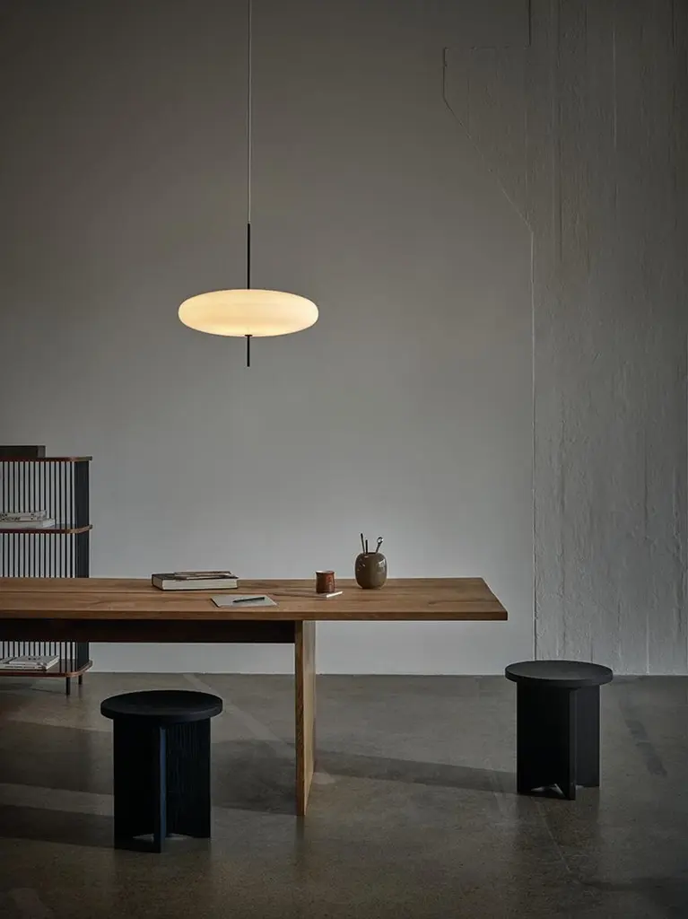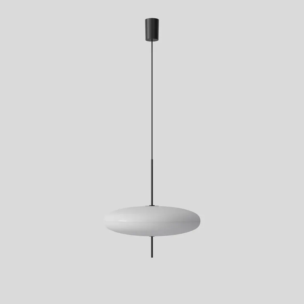 Gino Sarfatti lamp model 2065.White diffuser, black hardware, black cable.Manufactured by AstepModel 2065Design by Gino SarfattiThe 2065 is made of two joined opaline methacrylate saucer-shaped diffusers suspended from the ceiling with a black painted aluminum canopy.The simplicity of the design and lightness of the materials makes for an elegant and free-floating Luminaire.Timeless innovation 1950-2016The suspension lamp designed in 1950 emphasizes the innovative, experimental approach of Gino Sarfatti. At that time, the favored material of the lighting industry was glass. But when Gino Sarfatti received the first samples of methacrylate in 1949-1950, a new polymer plastic that was much stronger and lighter than glass, his experiments led him to a new suspension lamp, model 2065. As in so many of his designs, he continued to work with different compositions, dimensions and color variants over the following years.Model 2065 consists of a diffuser made of two joined opalescent saucers, suspended from the ceiling with a black-painted aluminum canopy. The simplicity of Gino Sarfatti’s elliptical design and the lightness of the materials make for a seemingly weightless Luminaire.The Luminaire was relaunched by Astep in 2016, which also introduced a black version where the upper saucer is finished with a soft-touch coating. This leaves the lower diffuser as the only light source, creating a more intimate light space and a strong, graphic expression. In a continuation of the original idea, five LED bulbs provide the lighting in both versions.Specifications model 2065Typology suspensionMaterials opaline methacrylate diffusers, aluminum structureDimensions: Ø 538 x 546mmDiffuser diameter Ø 538mmCable length 4000mmWeight 2.70kgLight source 5 x E14 LED 4.5W470lm (2350lm total)2700KDimmable bulbs IncludedNot UL listedThis lamp is wired for Europe, if used in US or any other country the client will need to convert it.Gino SarfattiBorn in Venice in 1912, Gino Sarfatti studied to become an aeronautical engineer until family circumstances compelled him to relocate to Milan where he had his first encounter with lighting, an engineering project to transform a glass vase into a lamp. This encounter with lighting design and engineering shaped the path of his life. In 1939 Gino Sarfatti founded his company Arteluce, which brought lighting into the 20th century combining innovative ideas with groundbreaking design.Arteluce won numerous prizes and awards including the Compasso d’Oro in 1954 and 1955, and the Honorary Diploma of the Milan Triennale, becoming an important meeting place for many leading Italian architects throughout the 1950s and 1960s. The first Milanese Arteluce retail space was designed with Marco Zanuso in 1951. Ten years later Gino Sarfatti and his lifelong friend Vittoriano Viganò designed their flagship location on Via Della Spiga.Throughout his career, Gino Sarfatti explored and was inspired by new product typologies, innovative materials, lighting technologies, and production techniques. His hybrid talent as a designer and engineer enabled him to created refined products in both aesthetics and function.Gino Sarfatti was a significant figure in the history of Italian Industrial Design, developing more than 700 luminaires. In 1973 he retired on Lake Como, with Flos acquiring Arteluce and their expansive catalog.Gino Sarfatti died at Gravedona in 1985.
