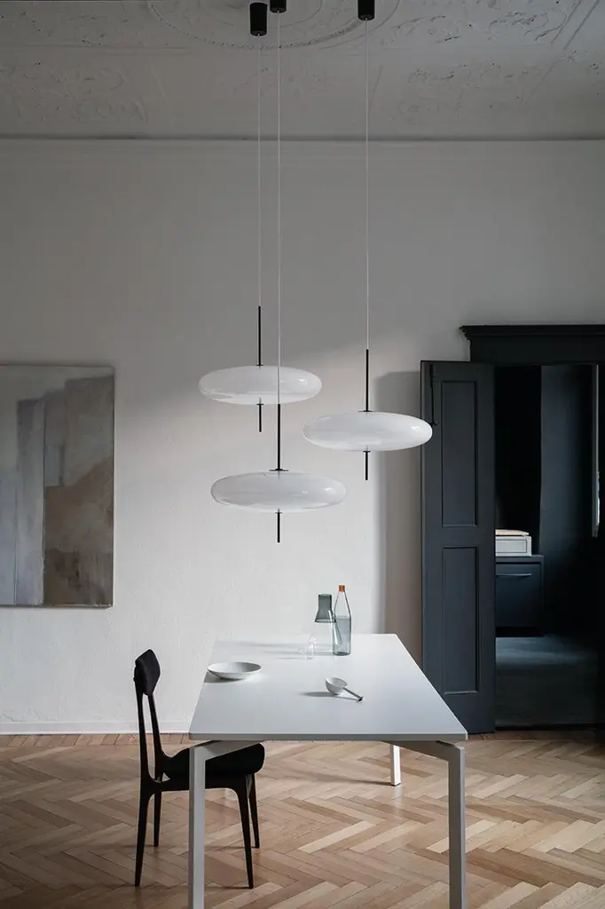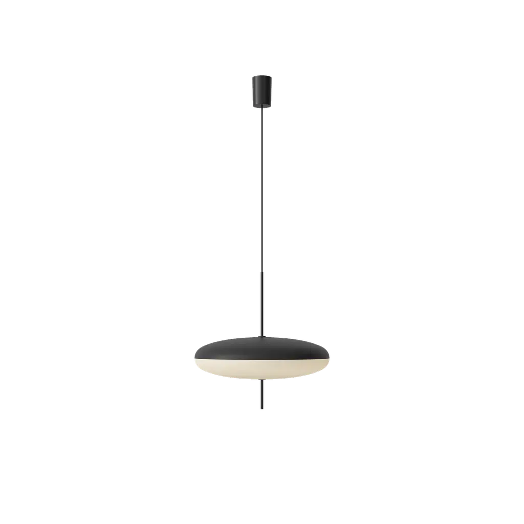 Gino Sarfatti lamp model 2065.White diffuser, black hardware, white cable.Manufactured by AstepModel 2065Design by Gino SarfattiThe 2065 is made of two joined opaline methacrylate saucer-shaped diffusers suspended from the ceiling with a black painted aluminum canopy.The simplicity of the design and lightness of the materials makes for an elegant and free-floating Luminaire.Timeless Innovation 1950-2016The suspension lamp designed in 1950 emphasizes the innovative, experimental approach of Gino Sarfatti. At that time, the favored material of the lighting industry was glass. But when Gino Sarfatti received the first samples of methacrylate in 1949-1950, a new polymer plastic that was much stronger and lighter than glass, his experiments led him to a new suspension lamp, Model 2065. As in so many of his designs, he continued to work with different compositions, dimensions and color variants over the following years.Model 2065 consists of a diffuser made of two joined opalescent saucers, suspended from the ceiling with a black-painted aluminum canopy. The simplicity of Gino Sarfatti’s elliptical design and the lightness of the materials make for a seemingly weightless Luminaire.The Luminaire was relaunched by Astep in 2016, which also introduced a black version where the upper saucer is finished with a soft-touch coating. This leaves the lower diffuser as the only light source, creating a more intimate light space and a strong, graphic expression. In a continuation of the original idea, five LED bulbs provide the lighting in both versions.Specifications model 2065Typology suspensionMaterials opaline methacrylate diffusers, aluminum structureDimensions: Ø 538 x 546mmDiffuser diameter Ø 538mmCable length 4000mmWeight 2.70kgLight source 5 x E14 LED 4.5W470lm (2350lm Total)2700KDimmable bulbs includedNot UL listed.This lamp is wired for Europe, if used in US or any other country the client will need to convert it.Gino SarfattiBorn in Venice in 1912, Gino Sarfatti studied to become an aeronautical engineer until family circumstances compelled him to relocate to Milan where he had his first encounter with lighting, an engineering project to transform a glass vase into a lamp. This encounter with lighting design and engineering shaped the path of his life. In 1939 Gino Sarfatti founded his company Arteluce, which brought lighting into the 20th century combining innovative ideas with groundbreaking design.Arteluce won numerous prizes and awards including the Compasso d’Oro in 1954 and 1955, and the Honorary Diploma of the Milan Triennale, becoming an important meeting place for many leading Italian architects throughout the 1950s and 1960s. The first Milanese Arteluce retail space was designed with Marco Zanuso in 1951. Ten years later Gino Sarfatti and his lifelong friend Vittoriano Viganò designed their flagship location on Via Della Spiga.Throughout his career, Gino Sarfatti explored and was inspired by new product typologies, innovative materials, lighting technologies, and production techniques. His hybrid talent as a designer and engineer enabled him to created refined products in both aesthetics and function.Gino Sarfatti was a significant figure in the history of Italian Industrial Design, developing more than 700 luminaires. In 1973 he retired on Lake Como, with Flos acquiring Arteluce and their expansive catalog.Gino Sarfatti died at Gravedona in 1985.