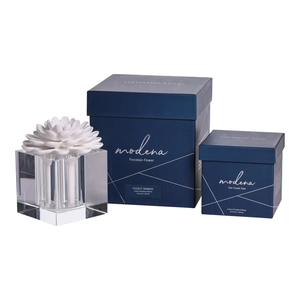 Enlightening. Elegant. Eye-catching. This lovely scent diffuser is a subtle way to softly fragrance a room all day. It comes in our gorgeous thick glass container with a floral porcelain topper that wicks and diffuses fragrance-no reeds required, and beautifully boxed.