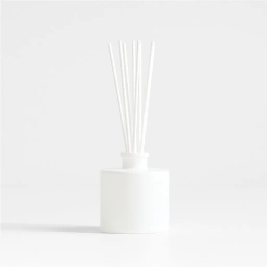 Utterly modern in monochromatic white. Our reed diffuser infuses the air with the invigorating scents of lemon zest, mint and basil grounded by the richness of sage, cashmere wood and musk. The diffuser's white reeds absorb the oil and release the aroma gradually for the ideal level of scent. To refresh the fragrance, simply jiggle the reeds, or take them out and put them back in upside down. Packaged in a white gift box, the matte white glass vessel has a clean, crisp look that brightens your coffee table, dresser or mantel. Part of our Monochrome scent collection, the No. 01 Blanc diffuser is a Crate & Barrel exclusive.