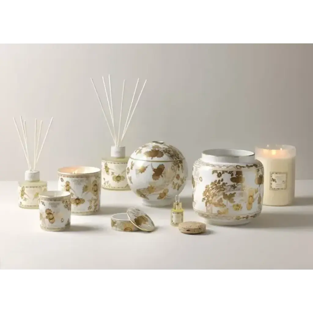 Room diffuser with Vicolo DELL’ORO fragrance. Oriente Italiano Gold collection. A perfect harmony between the fresh notes of Bergamot and Green Mandarin, the delicate Peony and the subtle hint of intense Boxwood are completed with the aroma of Musk that harmonizes the entire essence. The room perfume diffuser releases an intense floral-musky fragrance to give moments of pleasant relaxation, wrapped in the unique Ginori 1735 style. The set is completed by the diffuser vase in fine white porcelain from the Oriente Italiano Gold collection, in the Aurum decoration in hand-painted pure gold, which is woven with the classic lines of the distinctive design of the Florentine manufacture.