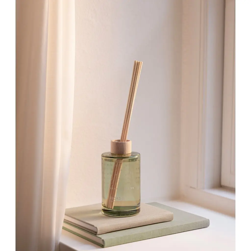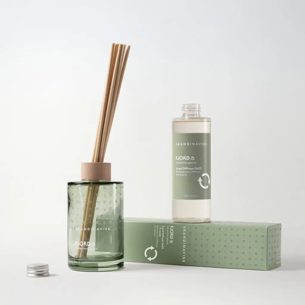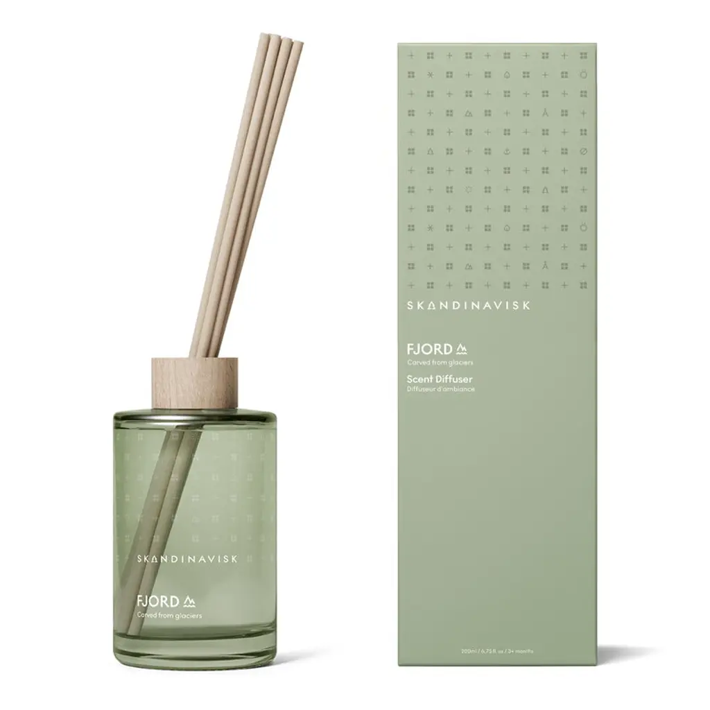 Skandinavisk's Fjord scent diffuser features notes of woods, ripe fruit, wild berries, black currants and raspberry flowers. The scent transports you to the Norwegian fjords and their coniferous forests, abundant orchards and rushing waterfalls. The Skandinavisk scent diffuser provides your home with a sophisticated Nordic fragrance. The amount of rattan reed sticks determines the intensity of the scent – place a single stick in the bottle if you prefer a subtle scent, and more, if you wish to enjoy the unique fragrance to the fullest. The lovely glass bottle is perfected with a beechwood ring and it doubles as a stylish decor object or a small vase for wildflowers. Made from renewably farmed vegetable oils, the alcohol-free and non-hazardous scent lasts for about three months, and thanks to the separately sold refills, the bottle can be refilled endlessly.