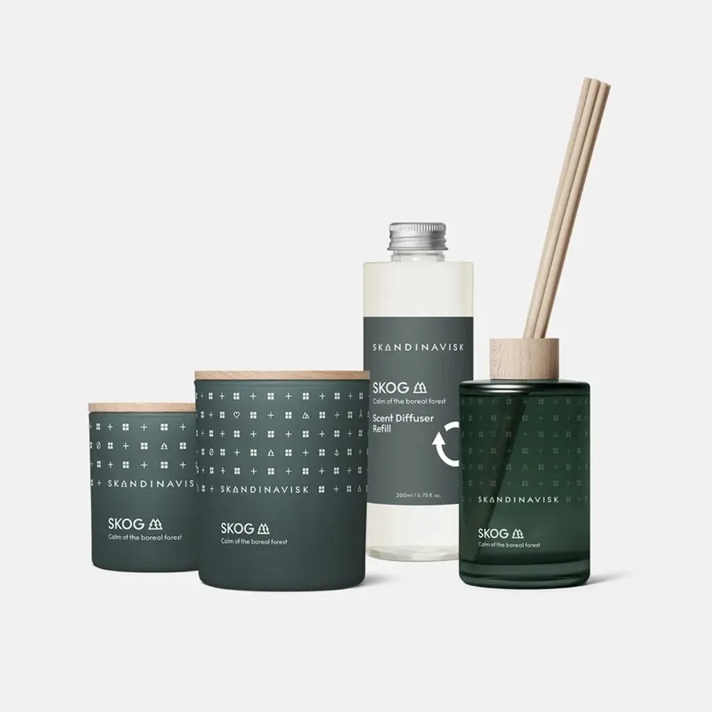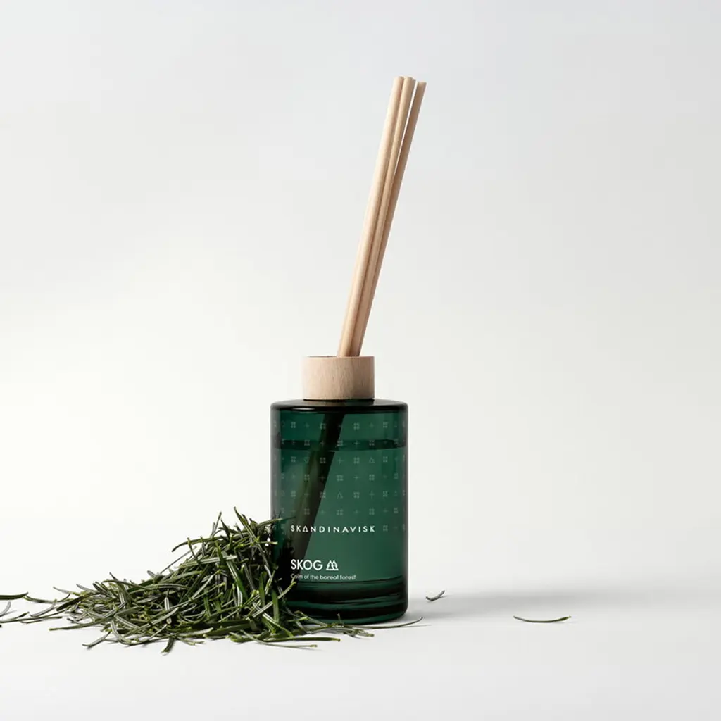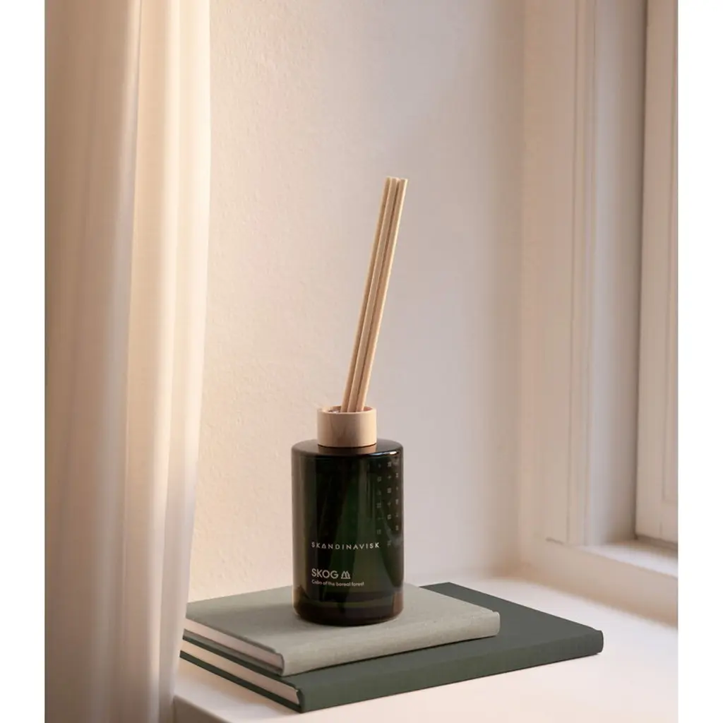 Skandinavisk's Skog scent diffuser features notes of pine, fir, birch sap and woodland lily of the valley. Named after the Swedish and Norwegian words for "forest", Skog depicts the magical scents lingering in the Scandinavian wilderness. The Skandinavisk scent diffuser provides your home with a sophisticated Nordic fragrance. The amount of rattan reed sticks determines the intensity of the scent – place a single stick in the bottle if you prefer a subtle scent, and more, if you wish to enjoy the unique fragrance to the fullest. The lovely glass bottle is perfected with a beechwood ring and it doubles as a stylish decor object or a small vase for wildflowers. Made from renewably farmed vegetable oils, the alcohol-free and non-hazardous scent lasts for about three months, and thanks to the separately sold refills, the bottle can be refilled endlessly.