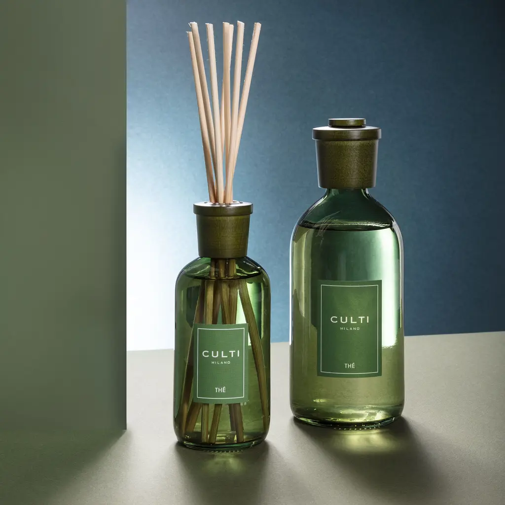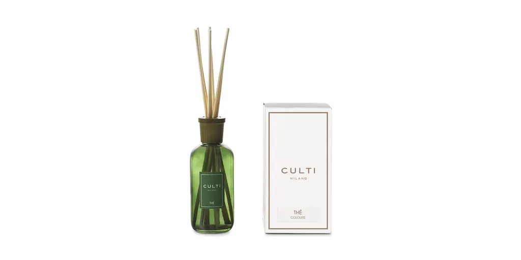 The colored glass cylindrical bottle with matching label and a green maple wood cap distinguish the pure and elegant aesthetic of the CULTI MILANO COLOURS line and adds a delightful burst of energy to liven up any room. This evokes relaxation and serenity just like soaking in the meditative warmth of a bath tub filled with Japanese green tea. Envision the vapors rising hypnotically off the water, delicately diffusing and filling the room with the aroma of tea leaves.