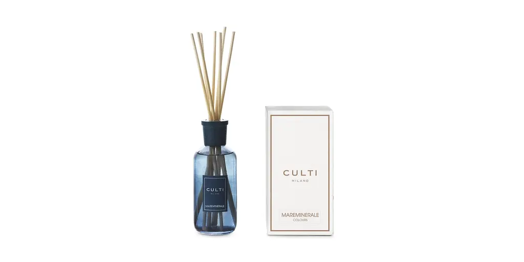 The blue cylindrical glass bottle with matching label and a blue maple wood cap distinguish the pure and elegant aesthetic of the CULTI MILANO COLOURS line and adds a delightful burst of energy to liven up any room. The Mareminerale scent encapsulates the stimulating and oxygenating energy of the sea. Envision footsteps that land softly on the shore and the smell of driftwood smoothed by the rocking of the waves.