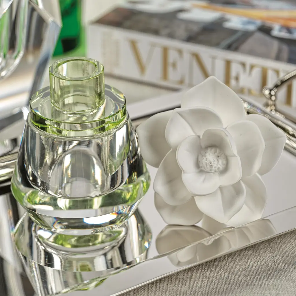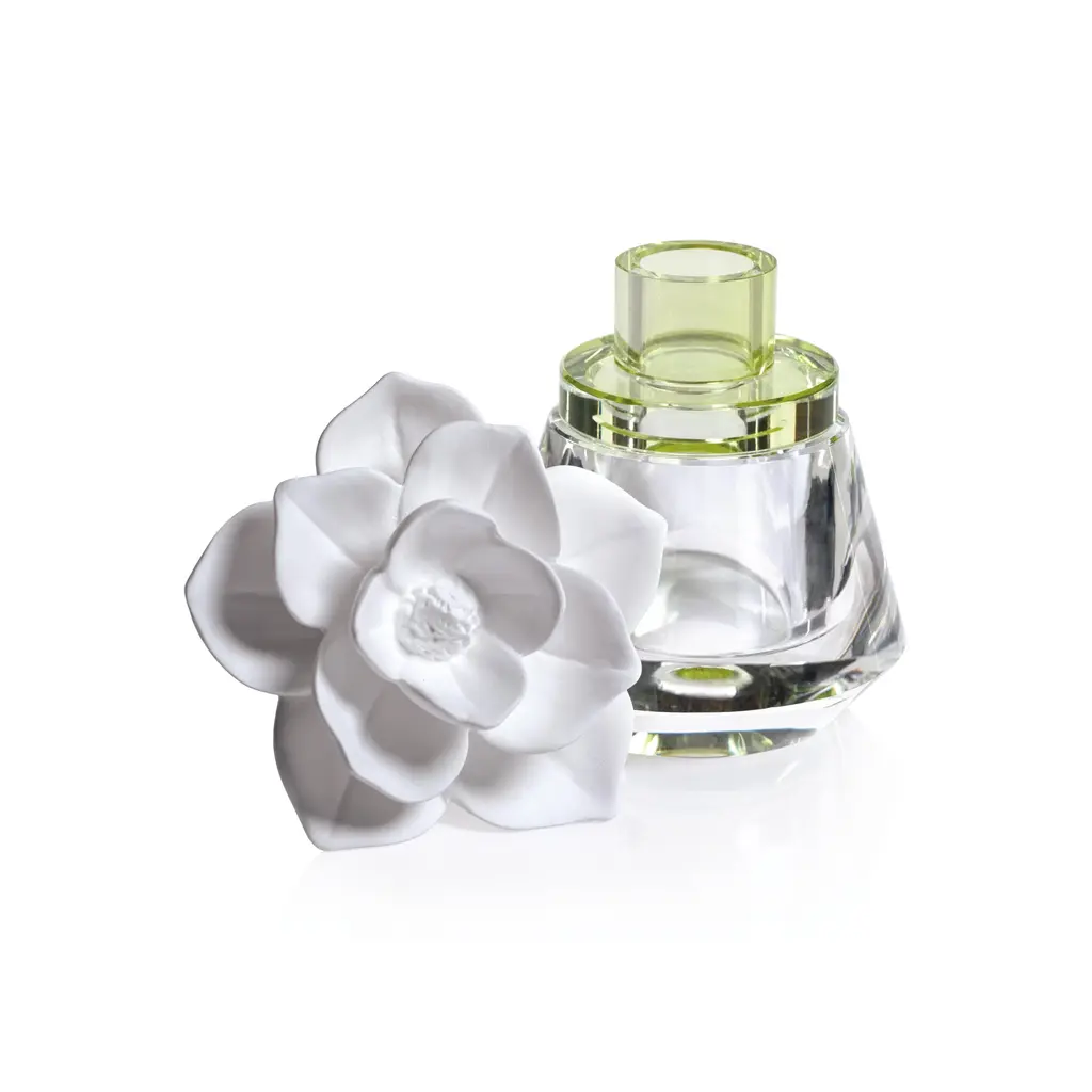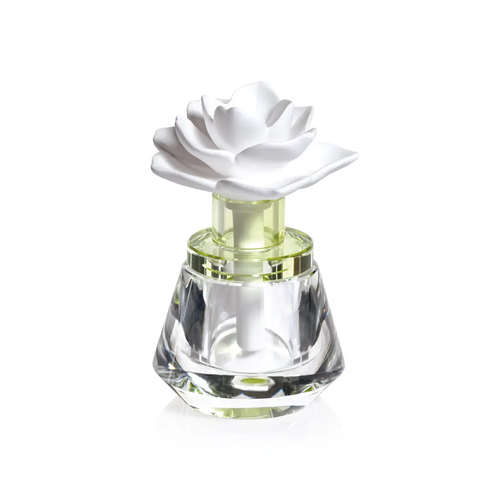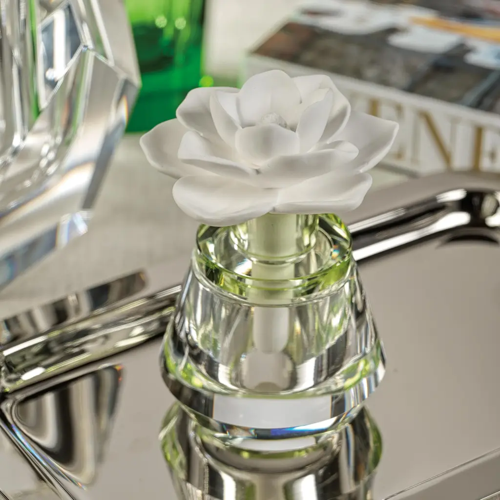 Elegant, simple and soothing. These are the three words that come to mind when looking at these beautiful and modern porcelain diffusers. This design features a lovely crystal shaped body with a subtle hint of color and white porcelain flower top to diffuse the aromas. This diffuser is perfect for anyone looking for a sleek and elegant design that will look great in any room. Colors: Clear, Light Green Materials: Crystal/ Porcelain Presented in a gorgeous crystal glass vessel An excellent way to add a spot of fragrance and a beautiful tabletop decor to your home or office Oil volume: 100 ml/ 3.39 oz Product dims: Approx. 4" x 4" x 5.25" Gift box dims: 8.5" x 5.75" x 7.75" Care Instructions: Wipe down with a soft, dry cloth. Do not place porcelain diffuser on furniture or counter top without a protective tray.