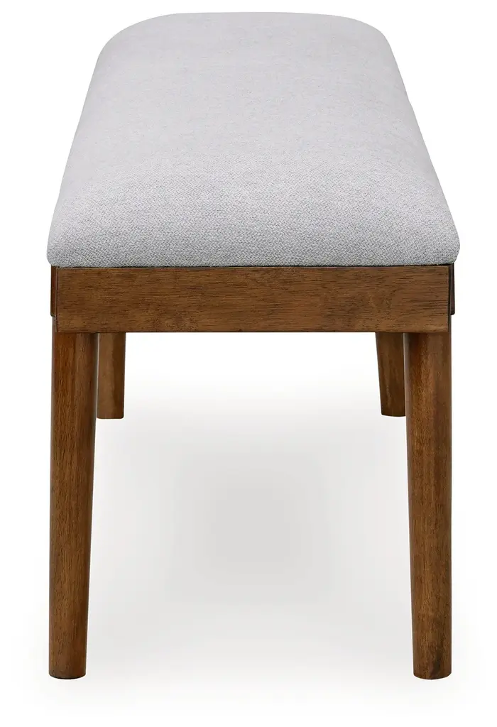 A refreshed take on retro aesthetics. This upholstered bench adds an air of simplicity to your dining space, capturing the architectural language of mid-century stylings. Its seat invites the eye with a soft-edged silhouette and neutral gray cushion. A casual, yet timeless, finish on the frame creates visual contrast to complete this study in form and function.