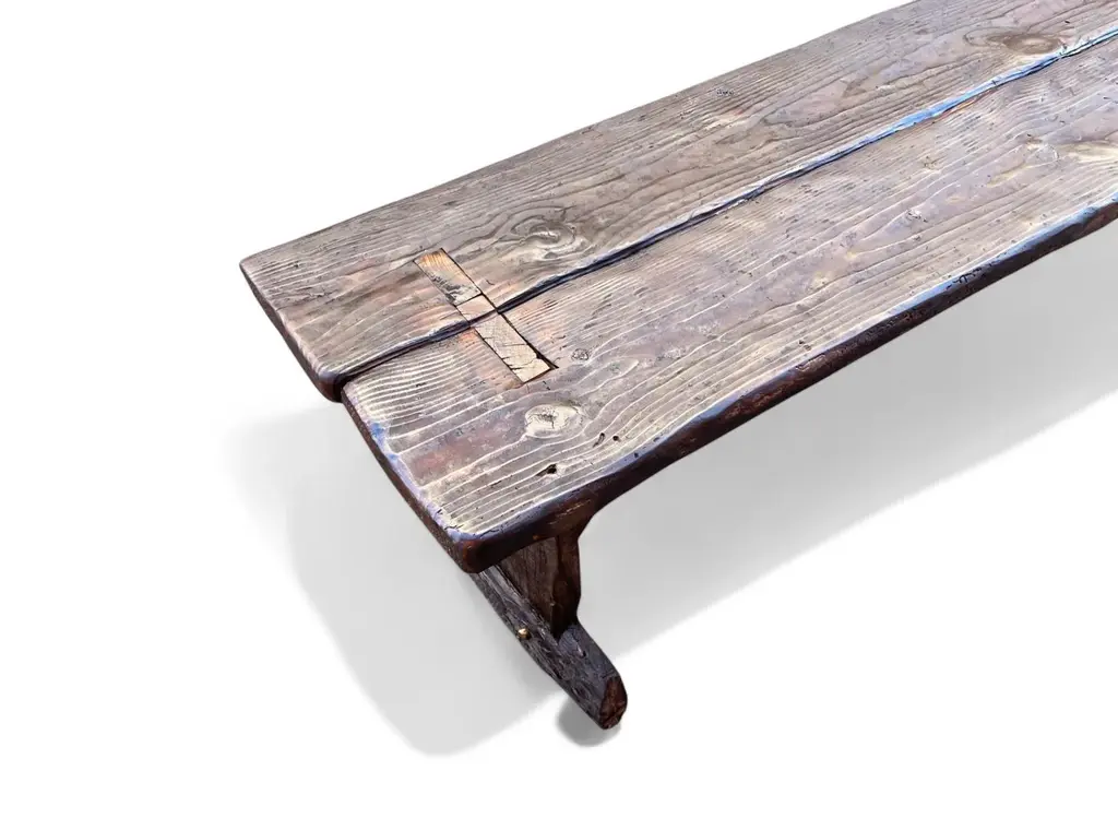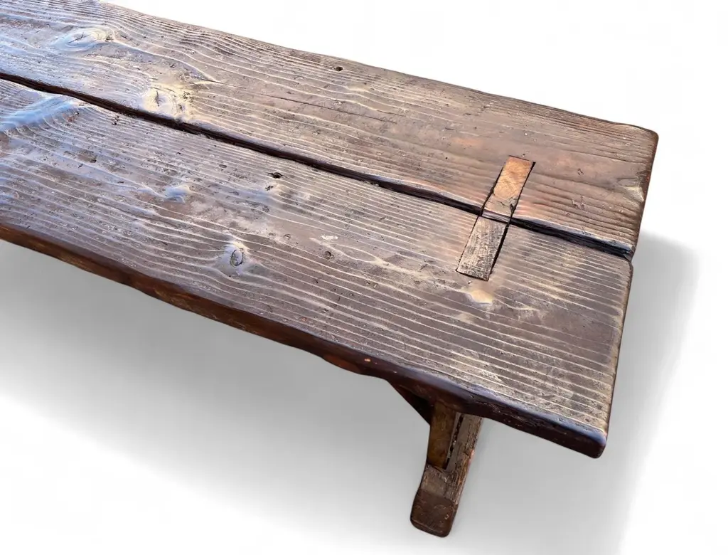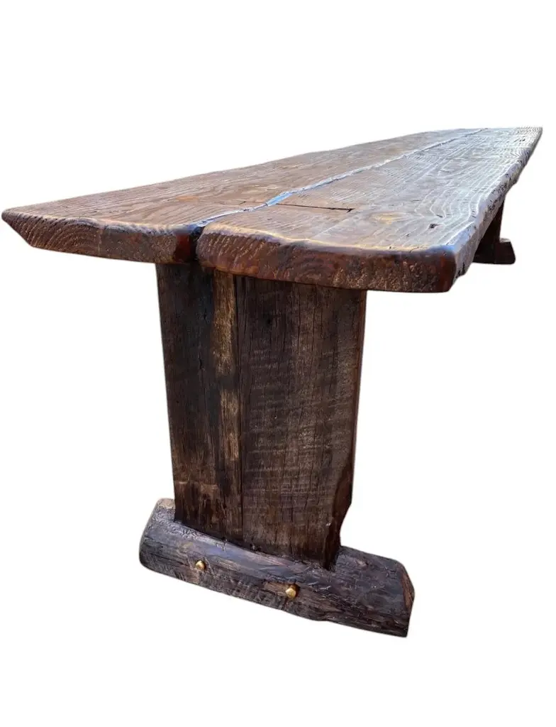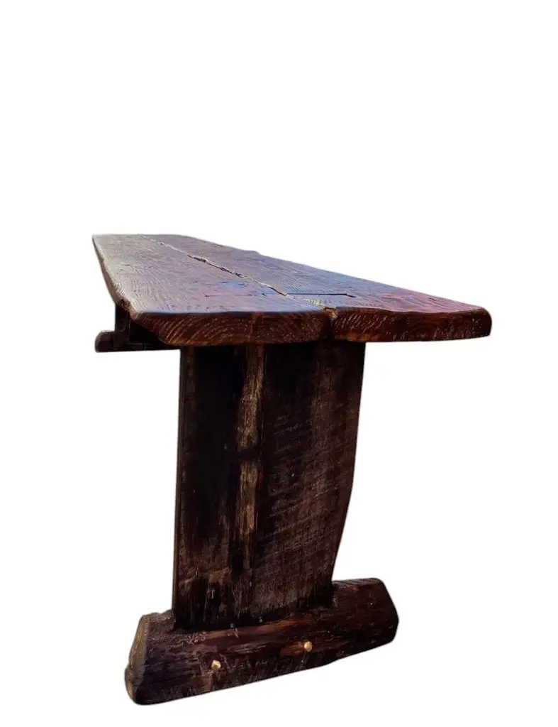 Archaic’s made-to-order farmhouse bench is built in the Rustic French style using century-old reclaimed barnwood—each piece handcrafted with care and intention. The design features a two-plank top, cantilevered leg supports, mortised joints, and solid dowel detailing in unlacquered brass in the espresso version. No modern hardware is visible, honoring traditional joinery throughout. This bench is available in two finish options: a warm, natural tone that highlights the raw beauty of the wood, or our custom espresso finish, sealed with a matte clear coat. Benches measuring 90 inches and longer include an undercarriage stretcher for added strength and durability. Style & Materials Built from century-old reclaimed barnwood with natural saw marks and patina Wood species may include white and red oak, walnut, butternut, cypress, elm, white pine, and heart pine Mortise-and-tenon joinery with cantilevered leg supports Two-plank seat with solid unlacquered brass dowel accents Use It For A versatile bench suited for use in the dining room, entryway, hallway, or at the foot of a bed. Also ideal in gallery, retail, or hospitality spaces needing lasting craftsmanship and visual presence. Dimensions 16"D x 18"H