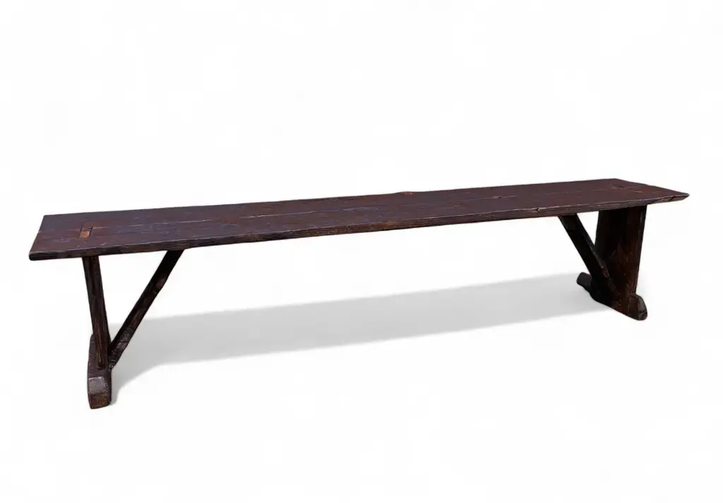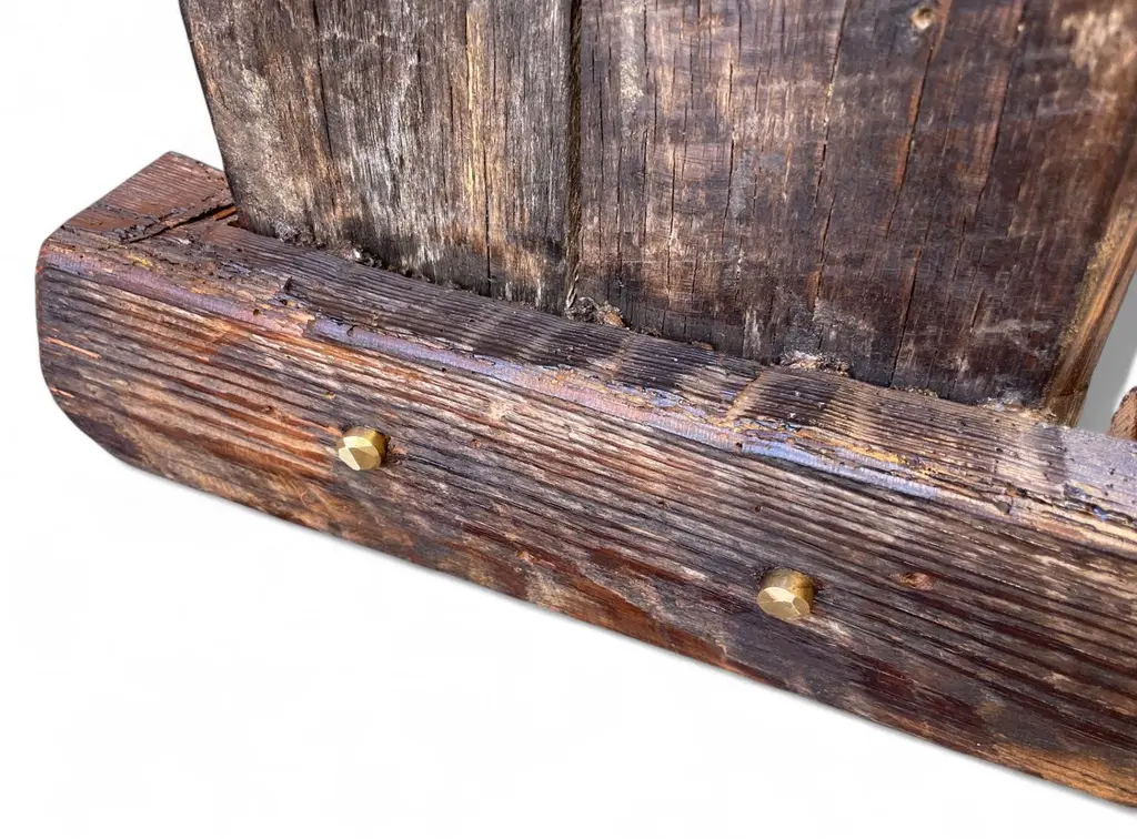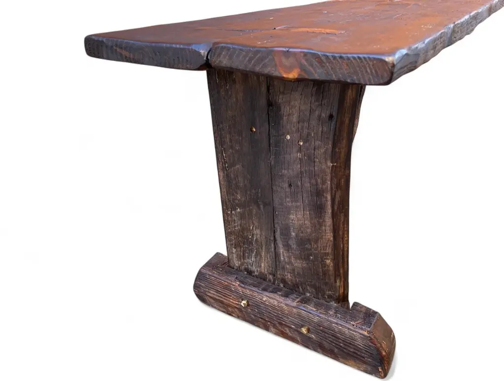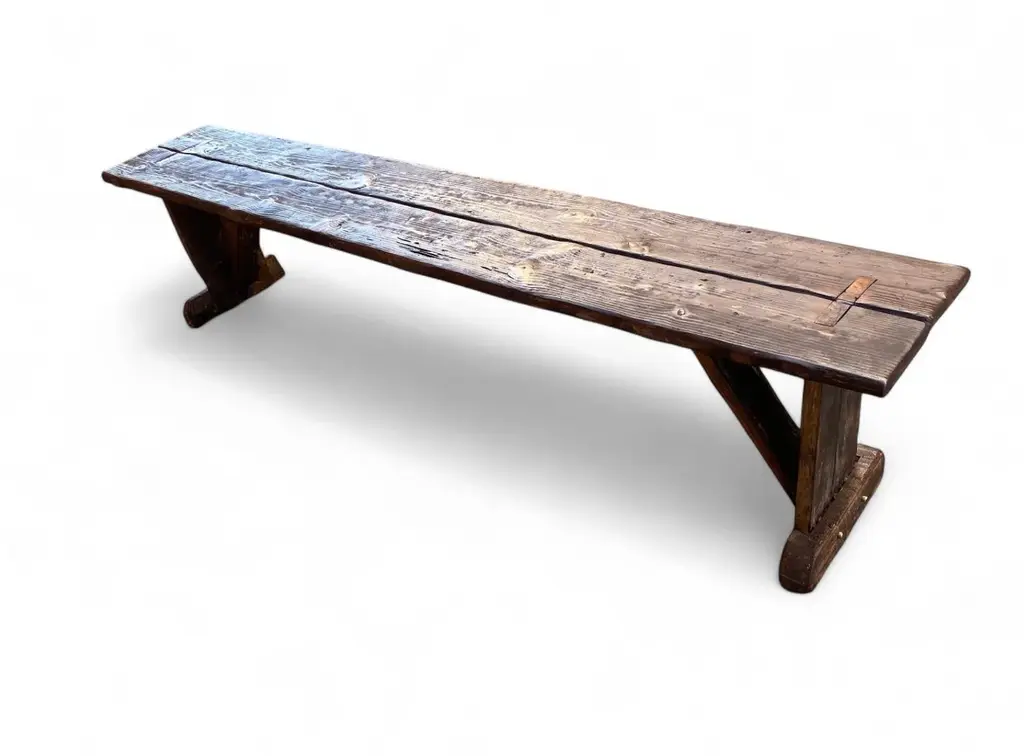 Archaic’s made-to-order farmhouse bench is built in the Rustic French style using century-old reclaimed barnwood—each piece handcrafted with care and intention. The design features a two-plank top, cantilevered leg supports, mortised joints, and solid dowel detailing in unlacquered brass in the espresso version. No modern hardware is visible, honoring traditional joinery throughout. This bench is available in two finish options: a warm, natural tone that highlights the raw beauty of the wood, or our custom espresso finish, sealed with a matte clear coat. Benches measuring 90 inches and longer include an undercarriage stretcher for added strength and durability. Style & Materials Built from century-old reclaimed barnwood with natural saw marks and patina Wood species may include white and red oak, walnut, butternut, cypress, elm, white pine, and heart pine Mortise-and-tenon joinery with cantilevered leg supports Two-plank seat with solid unlacquered brass dowel accents Use It For A versatile bench suited for use in the dining room, entryway, hallway, or at the foot of a bed. Also ideal in gallery, retail, or hospitality spaces needing lasting craftsmanship and visual presence. Dimensions 16"D x 18"H