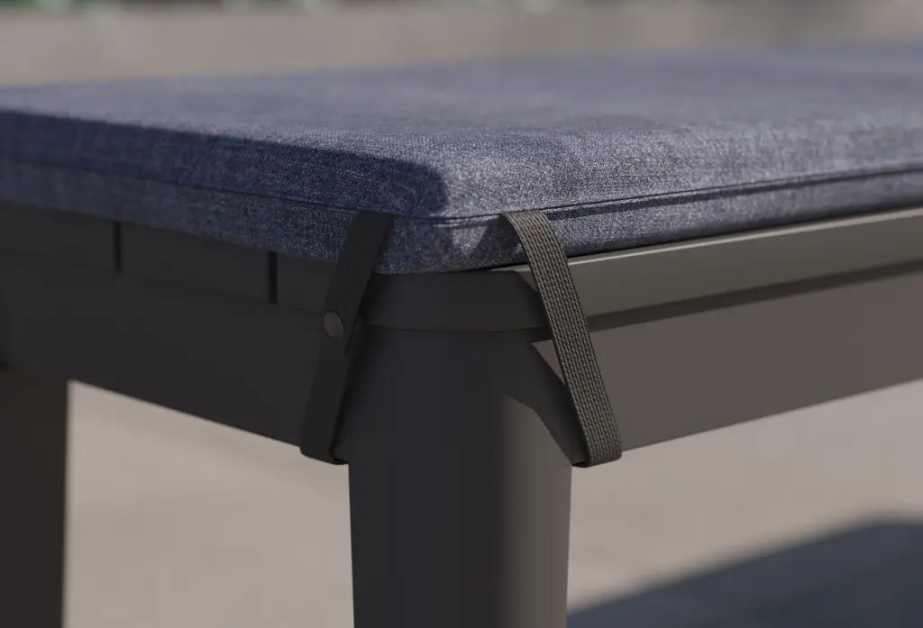 Enjoy the perfect blend of comfort, durability, and casual style with our Aluminum Dining Bench Cushion. Thoughtfully designed for added convenience and to enhance the comfort of your dining bench, the Aluminum Outdoor Dining Bench Cushion makes every alfresco meal even more relaxing and enjoyable. The cushion snaps securely onto your Aluminum Dining Bench, ensuring it stays in place. And, when your dining set is not in use, the cushion's foldable design and carrying handle make it effortless to transport and store. Crafted with our innovative OuterWeave® performance fabric, this cushion offers a soft and luxurious feel while being engineered to withstand the elements, resisting water, stains, mold, and fading. Plus, our eco-friendly solution-dyed fabric requires less dye, ensuring vibrant, long-lasting color while being kind to the environment.