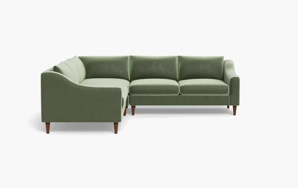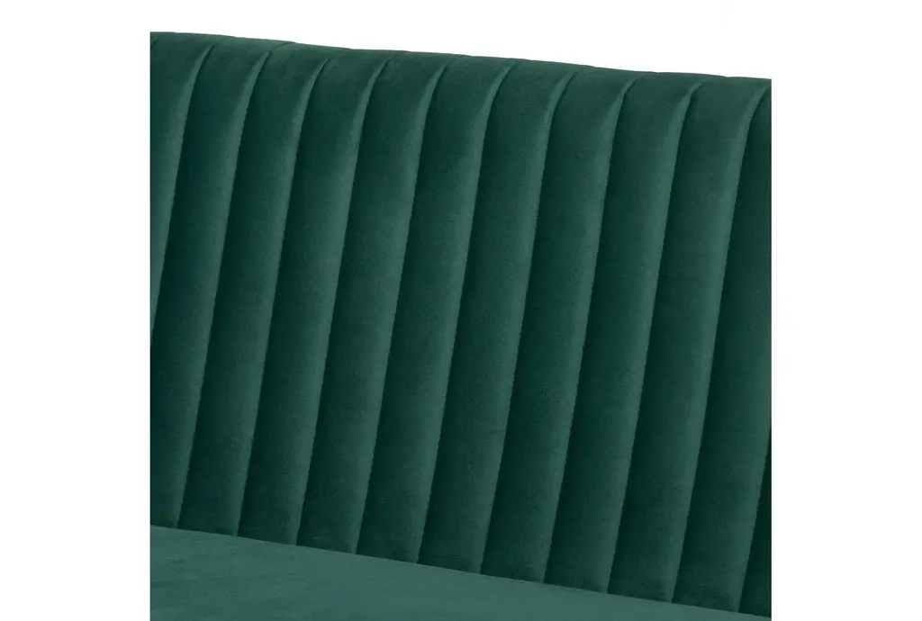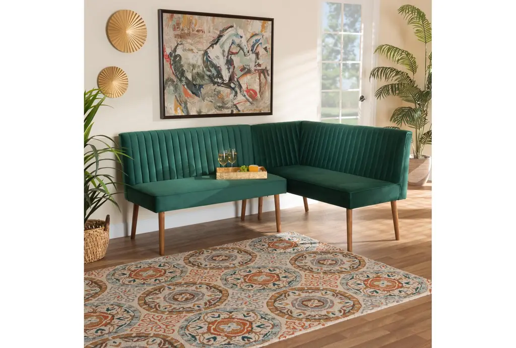 Enhance your dining or living room with the Alvis Mid-Century Modern Emerald Green Velvet Upholstered and Walnut Brown Wood 2-Piece Dining Nook Banquette. This stylish nook features a high back and is designed to fit perfectly in a corner, creating a cozy and inviting space. The rich emerald green velvet upholstery and walnut brown wood legs add a touch of sophistication to any room.