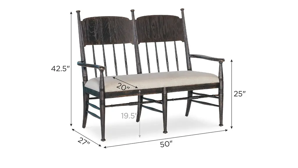 Celebrating the natural beauty of a simpler time, the inviting Americana Dining Bench has a nostalgic design including a spindle-style back with carved accents on the spindles and frame. The fabric seat is upholstered in the linen Biscuit performance fabric with welt trim. Crafted of Oak Veneers, the bench is finished in the Molasses finish, with the look of pieces passed down through the family over time and revealing the rich oak character beneath.