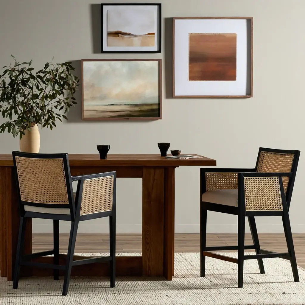 Mixed materials add a fresh take to this dining bench's midcentury form. Brushed ebony nettlewood frames a textural inlay of natural cane for a coastal nod, while linen-blend high-performance seating adds modern sensibility. Ships In 10-14 Business Days Brass kickplate Natural cane back and sides Performance fabric This image is for illustrative purposes only. The colors shown are accurate within the constraints of lighting, photography, and the color accuracy of your screen.