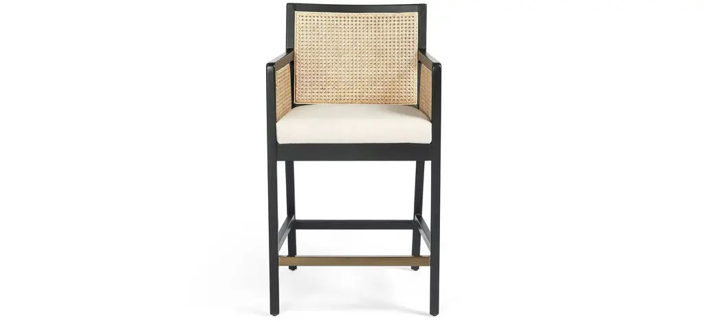 Mixed materials add a fresh take to this dining bench's midcentury form. Brushed ebony nettlewood frames a textural inlay of natural cane for a coastal nod, while linen-blend high-performance seating adds modern sensibility. Ships In 10-14 Business Days Brass kickplate Natural cane back and sides Performance fabric This image is for illustrative purposes only. The colors shown are accurate within the constraints of lighting, photography, and the color accuracy of your screen.