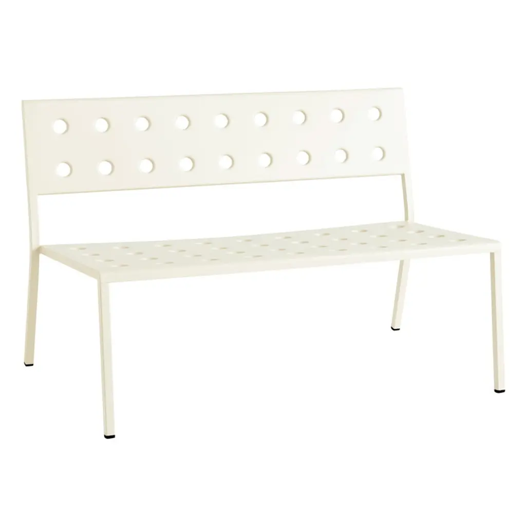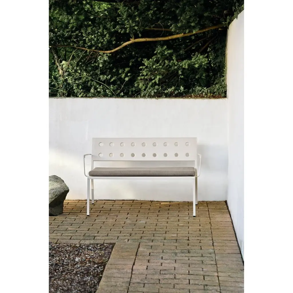 HAY's Balcony Dining bench with armrest is part of a clever collection of outdoor furniture designed by the Bouroullec brothers. Made of thin steel sheet, the elegant Balcony outdoor benches and seats are incomparably light and easy to move – a perfect addition to the garden, patio, terrace or balcony. The round holes pressed through the steel plate provide multiple functions: they add character and softness to the geometrical design and allow rainwater to drain off the bench's surface, while also strengthening the structure of the furniture. Featuring a weather-resistant coating the Balcony collection is as carefree as it looks. Try combining a high Balcony bench with a Balcony table of the same color – or choose a table in a completely different hue to create some funky color combinations! If you're looking for extra comfort, there are Balcony seat cushions sold separately, also available in many different pleasing shades.