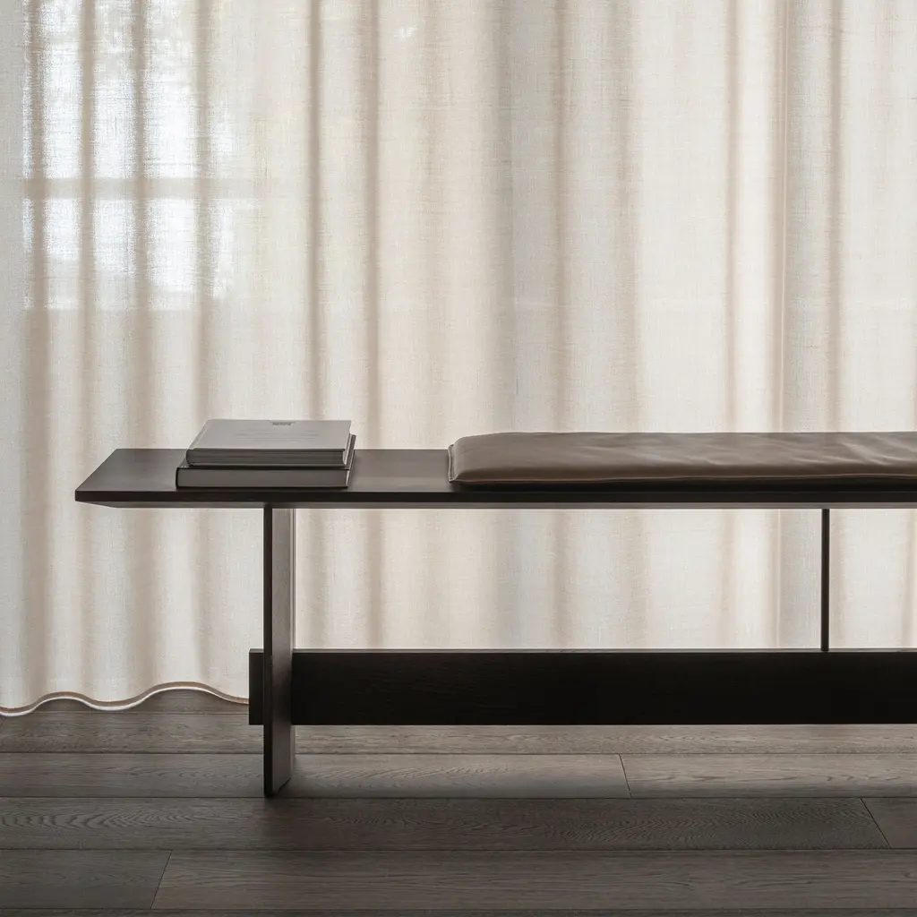 A sleek upholstered cushion in a choice of fine fabric or leather complements the harmonious lines of Tokyo designer Keiji Ashizawa's solid-oak bench. A-B01 takes form with a wafer-slim seat and legs that bespeak fine craftsmanship and a horizontal strut that braces the structure with a delicate steel rod. Available in a choice of 3 sizes, it's a multipurpose seating piece that finds favor in the entry, dining area or living spaces.