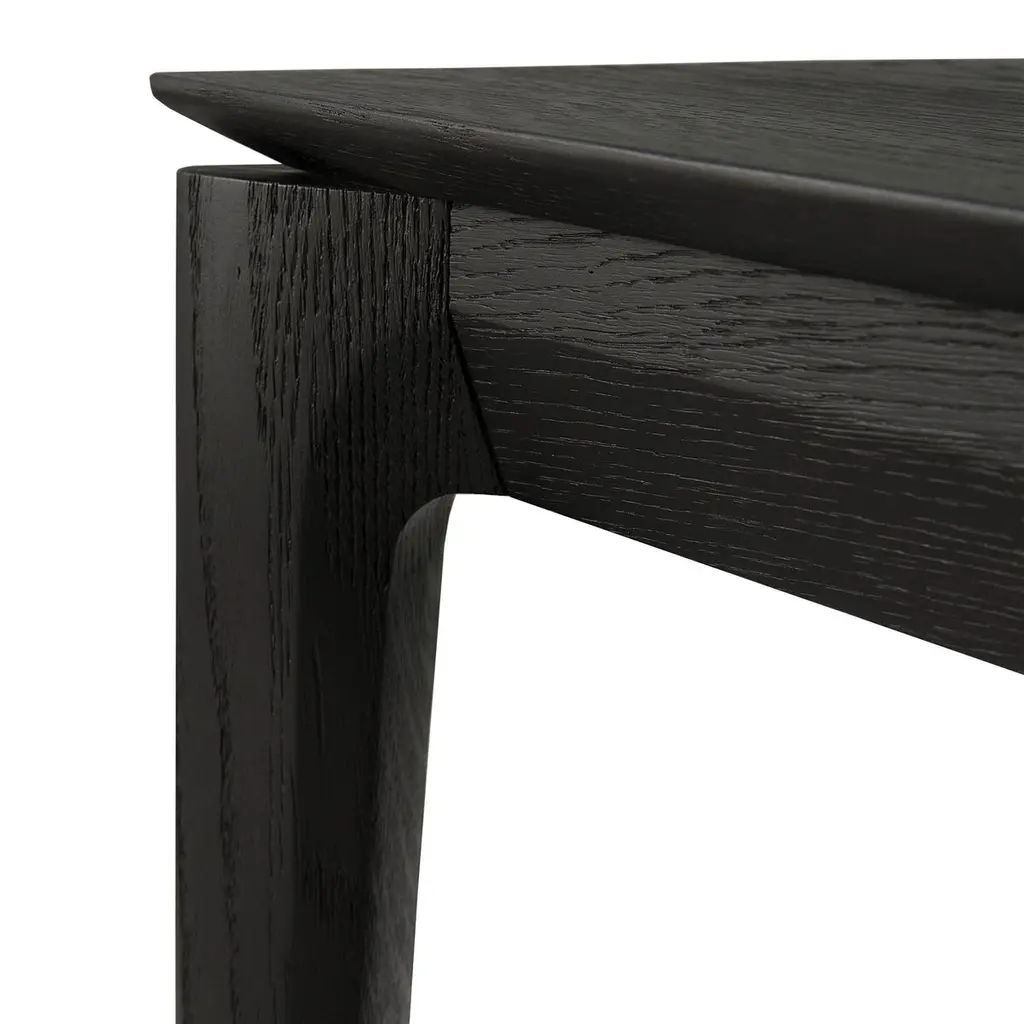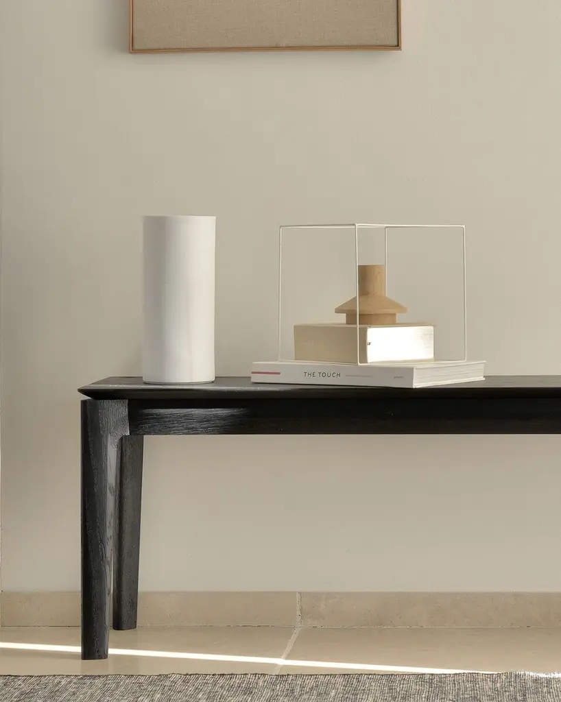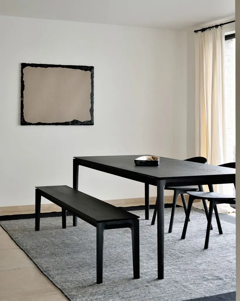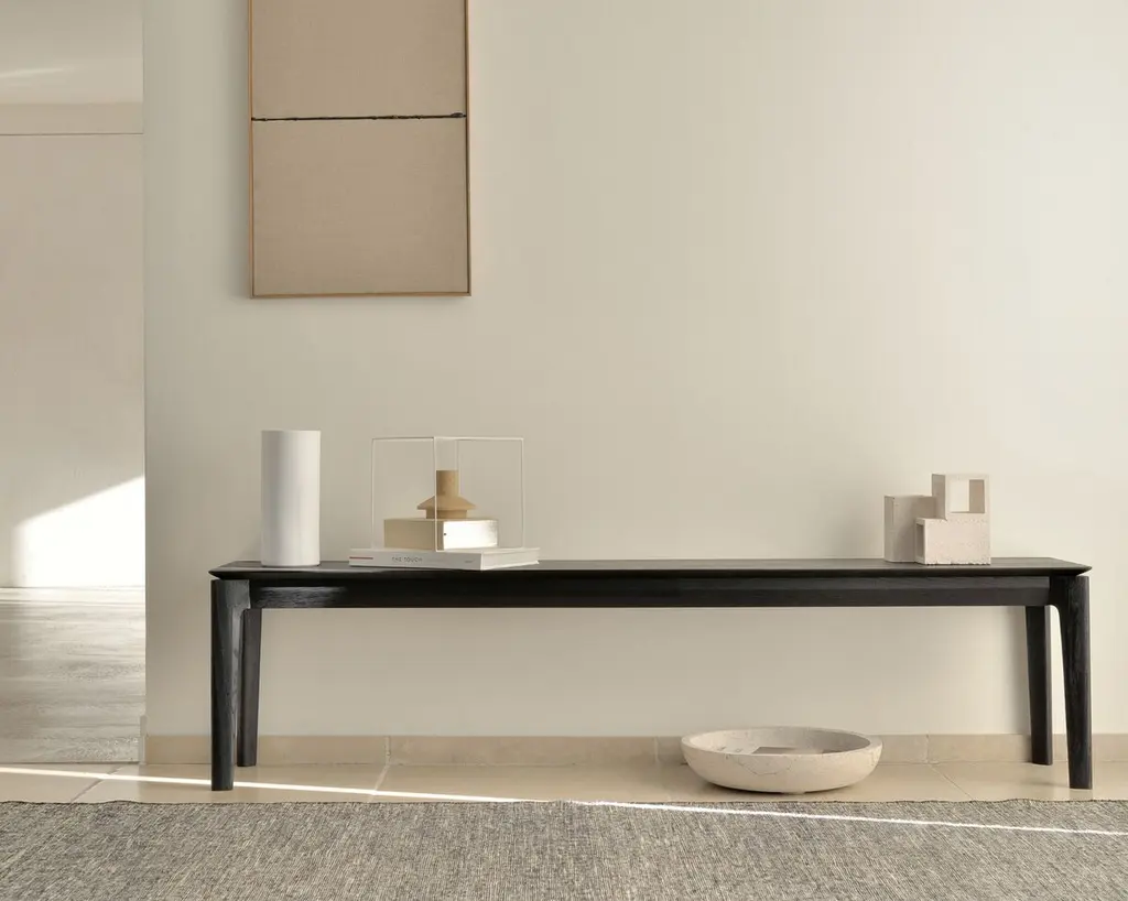 A companion to Ethnicraft's iconic Bok dining table, this bench is also well suited for an entry, below a window, or just about anywhere else on its own. Its beveled seat and subtly tapered legs show off the distinctive grain of the oak, a hardwood prized for its durabiity and resistance to scratches. The black finish heightens the elegance.
