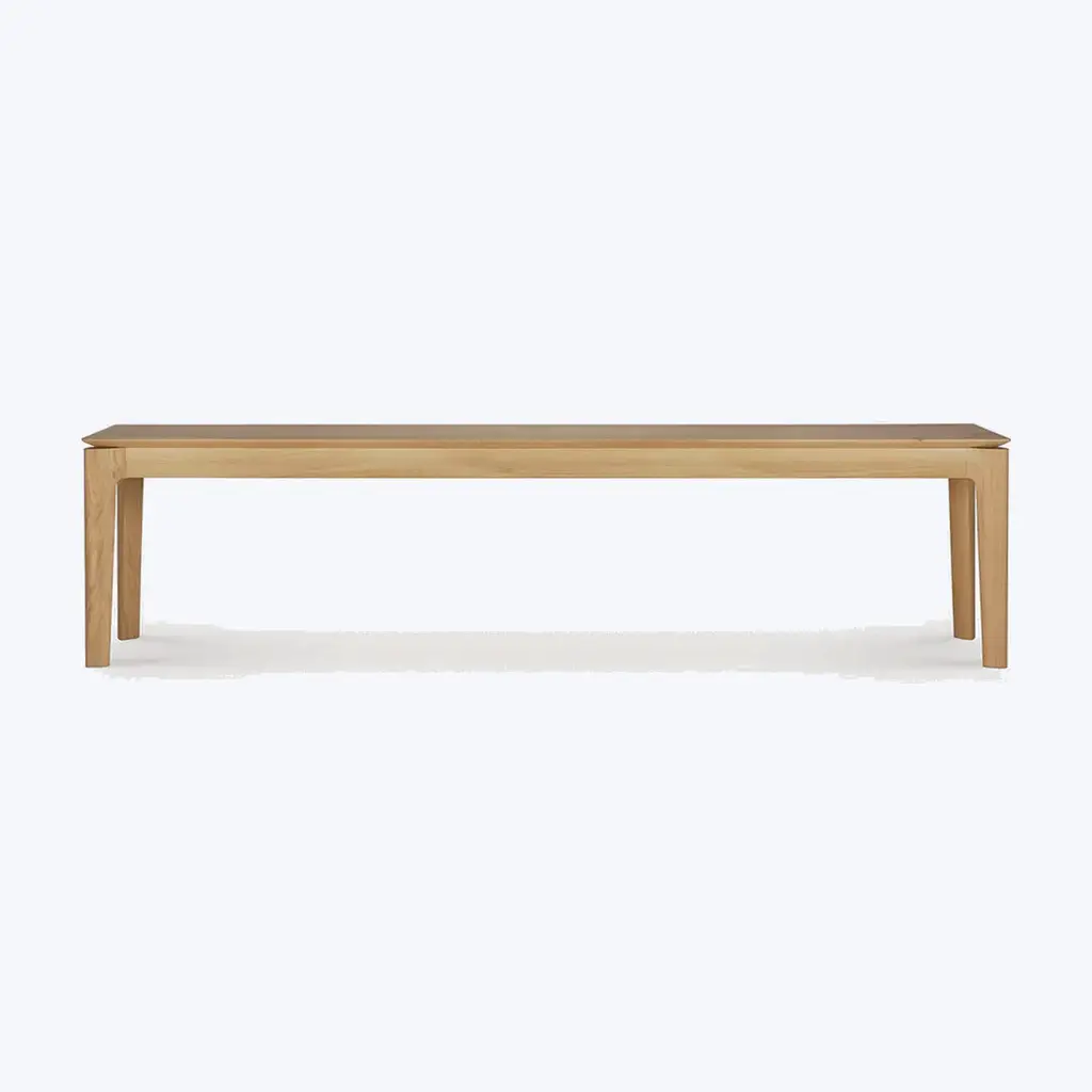 Bring beauty from the natural world into your indoor living spaces with the Oak Bok Bench from Ethnicraft. Designed by Alain Van Havre, this table features four rounded legs attached to a cross frame that supports a flat, bevel-sided seat. Offered in multiple sizes and finishes, the natural wood of each piece is smoothed to a natural gloss, infusing an impressive architectural lightness into robust construction. Reminiscent of a goat's curved horns, the Bok collection combines sculptural elegance with contemporary design to create an open and airy form. Ethnicraft creates organic, modern, and ageless furniture from solid wood ensuring that each piece will stand the test of time. Pair this bench with the Bok Dining Table to create a cohesive ensemble in your kitchen area. Alternatively, style this bench against a wall, in a hallway, or at the end of a bed for extra seating space or to showcase decor. Available in four sizes and two colors, you will certainly find a Bok Bench that perfectly fits into your home. Ethnicraft is committed to creating furniture that is dependable and full of character, offering a selection of stylish pieces for every home. Each piece showcases their commitment to outstanding craftsmanship, innovation, and sustainability. FSC Certified, Ethnicraft utilizes wood as the core feature of their products and consciously considers the environment in their manufacturing processes. Production waste, such as leftover wood and sawdust, is reused by their facilities for fuel in the drying ovens or compacted as a basis for pallets, ensuring ethical production practices with a zero waste policy.
