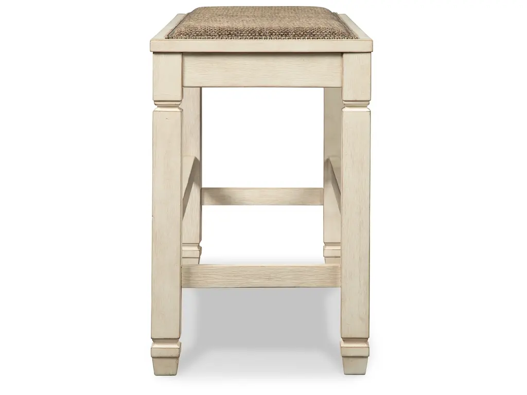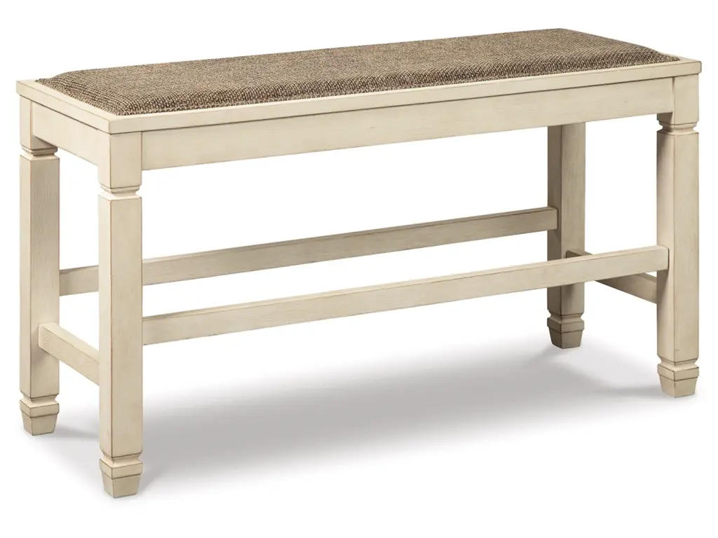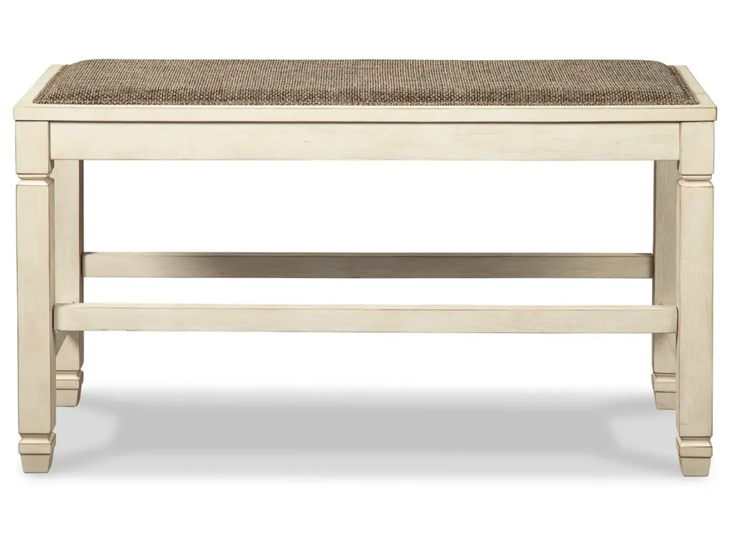 The beauty of the Bolanburg upholstered dining bench is something to savor. Serving up comfort and flair, this generously scaled counter-height bench entices with a cushioned seat covered in a heavy woven fabric that complements the antiqued white finish.