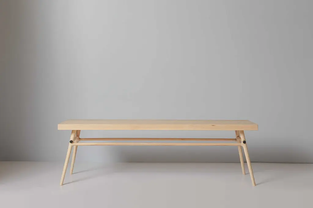The Bough Bench is constructed of solid American hardwood (Ash, Walnut, or White Oak) featuring complex, concealed joints of surprising strength and blackened steel hardware detailing on the cross beam. Designed as seating, to command a space on its own, or as a long coffee table. Wood is hand-rubbed and finished with Kalon Bare Finish, a natural oil/wax finish painstakingly developed to preserve the delicate and luminous beauty of raw wood.