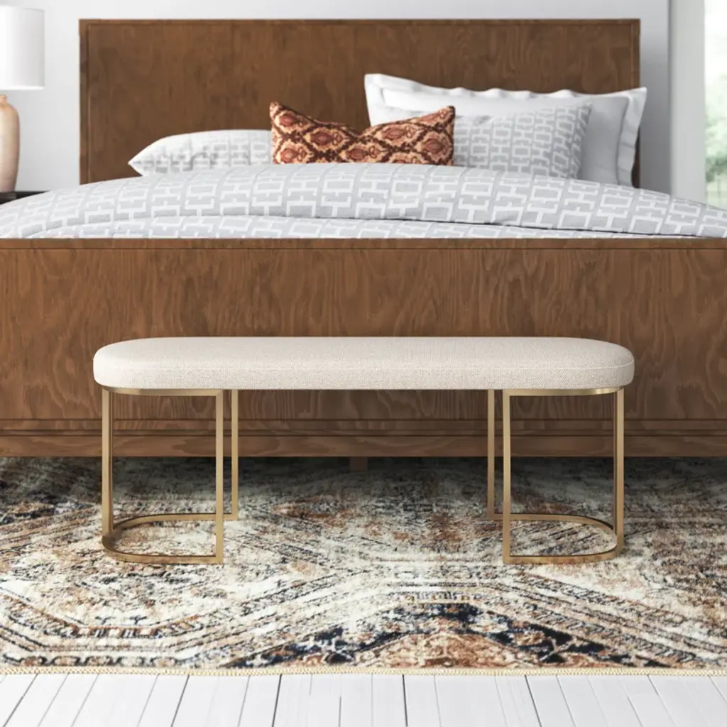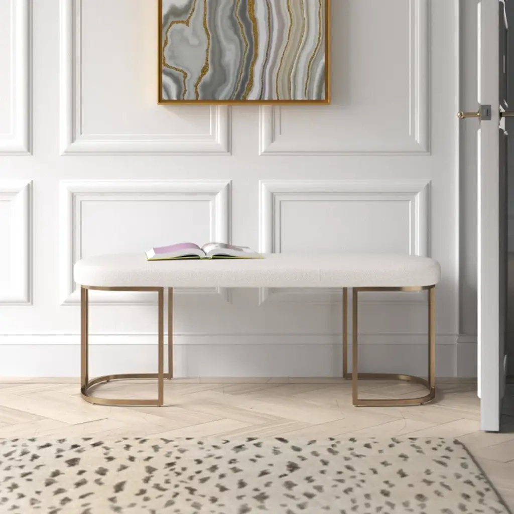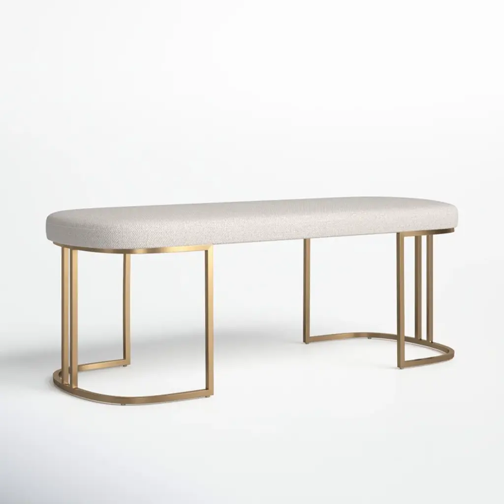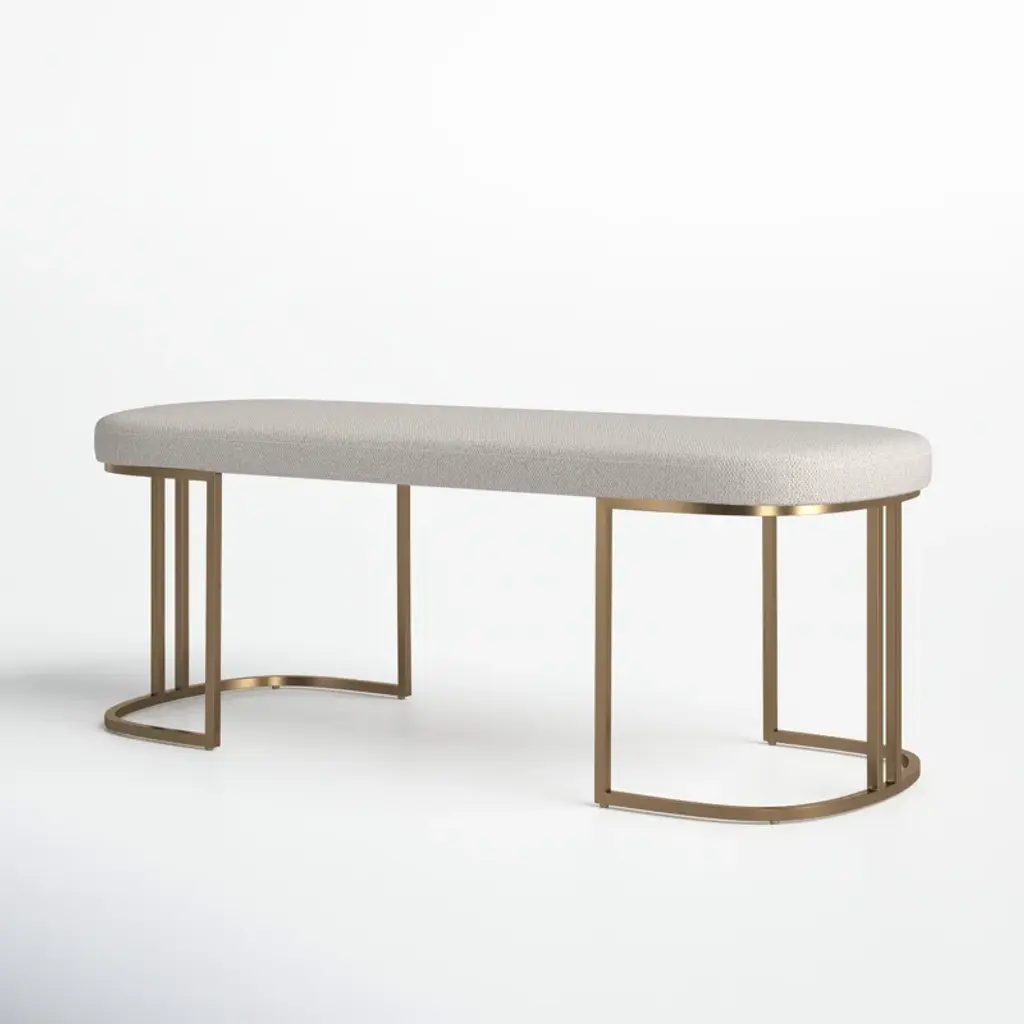 An elegant bench from our Ikon collection. Designed with soft, textured Belfast oyster shell fabric and an exposed antique brass stainless steel frame. Can be paired with a coordinating dining chair and dining armchair.