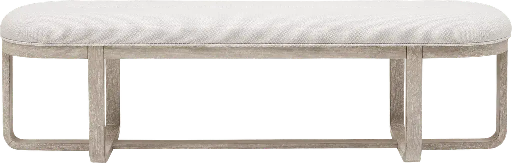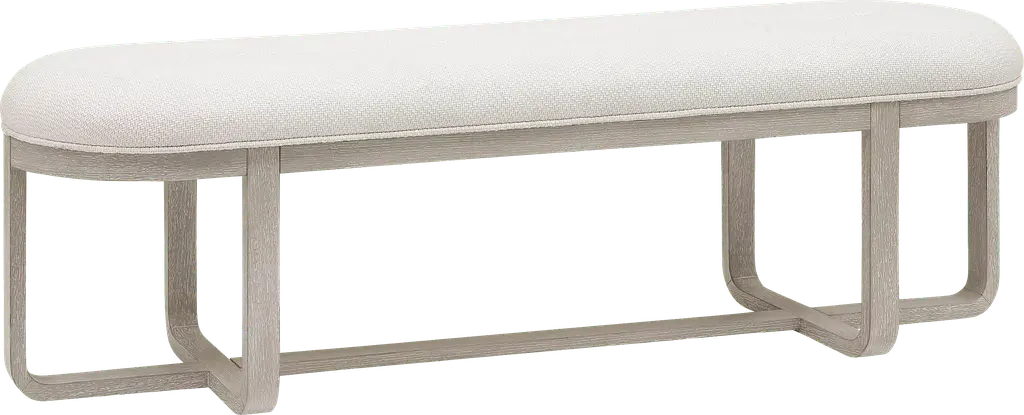 Subtle art deco flair infused with warm, family-friendly appeal is the hallmark of the captivating curves and lines of the Drew & Jonathan Canyon dining bench. Exuding contemporary charm, this piece is finished in a light gray hue and shaped into organic stirrup-style bends. An open pedestal design showcases the interconnected base, and a comfortable seat upholstered in white fabric invites comfortable, casual enjoyment.