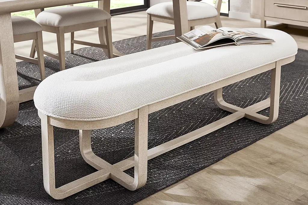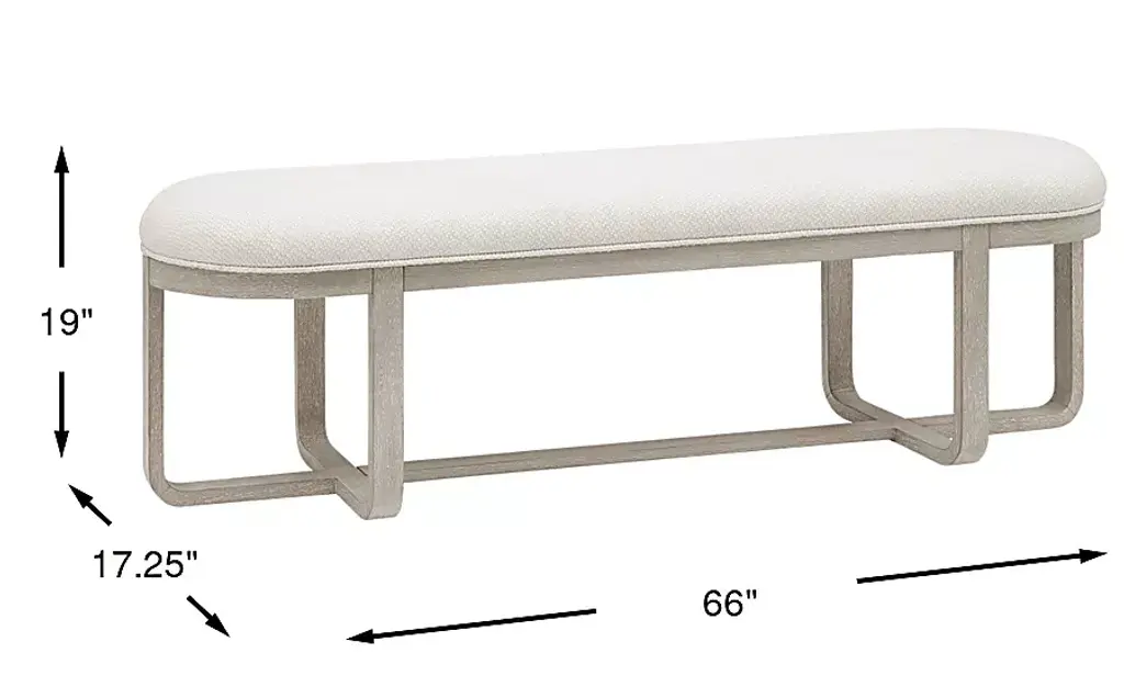 Subtle art deco flair infused with warm, family-friendly appeal is the hallmark of the captivating curves and lines of the Drew & Jonathan Canyon dining bench. Exuding contemporary charm, this piece is finished in a light gray hue and shaped into organic stirrup-style bends. An open pedestal design showcases the interconnected base, and a comfortable seat upholstered in white fabric invites comfortable, casual enjoyment.