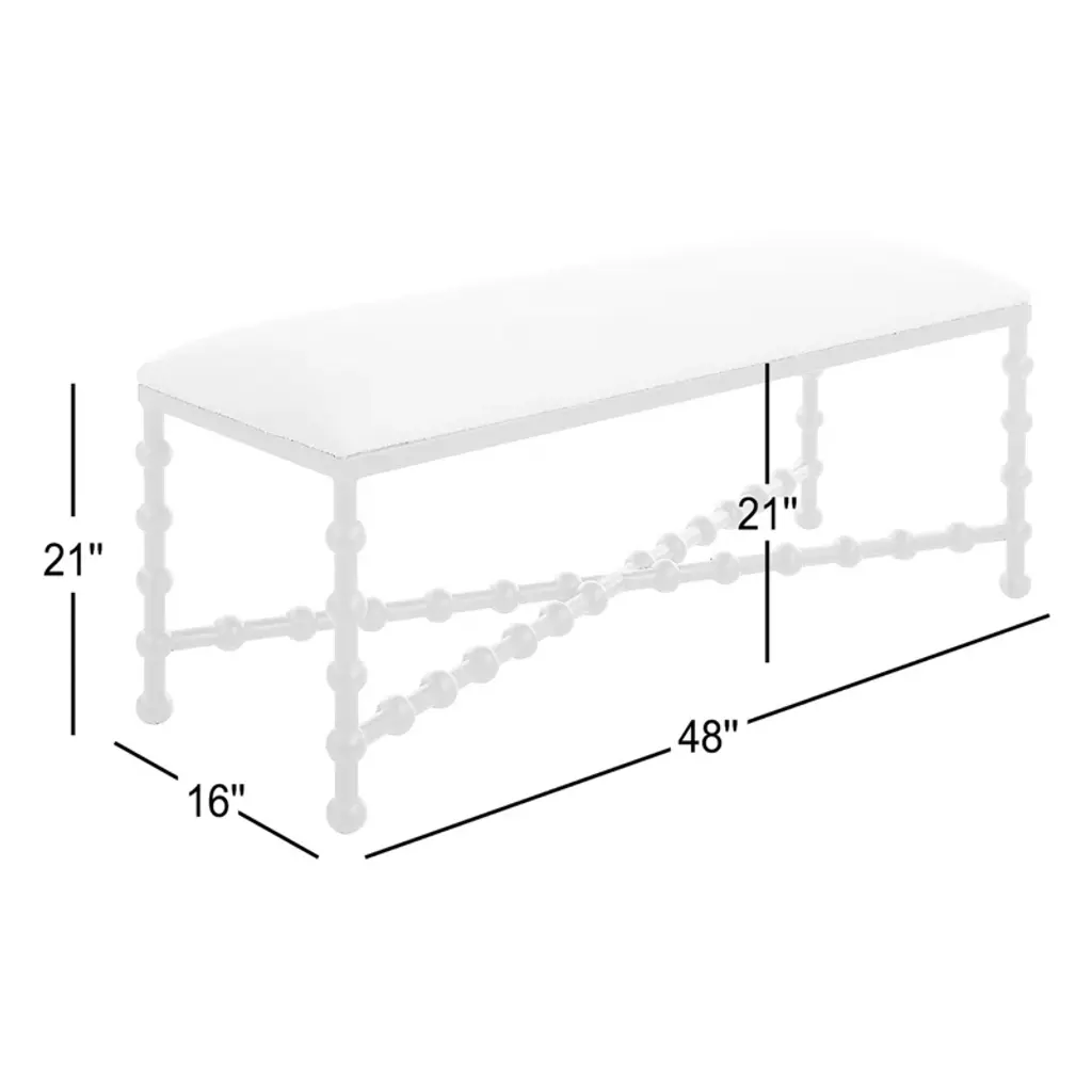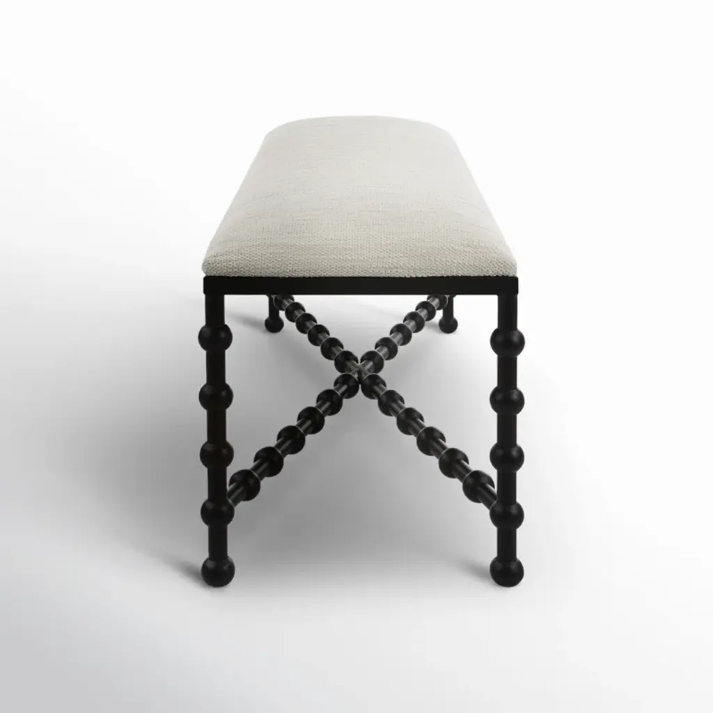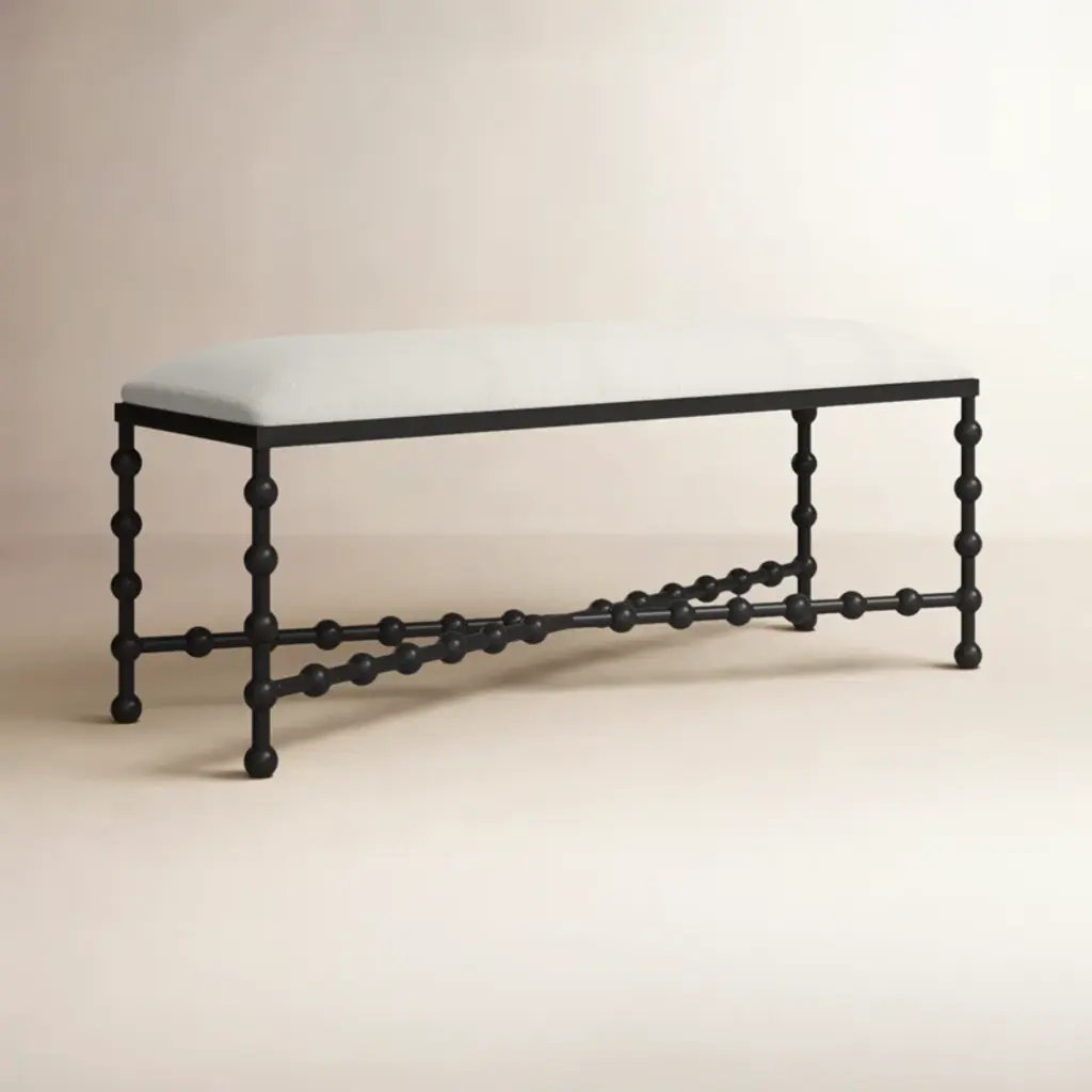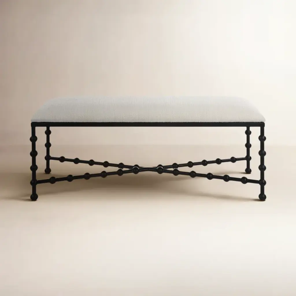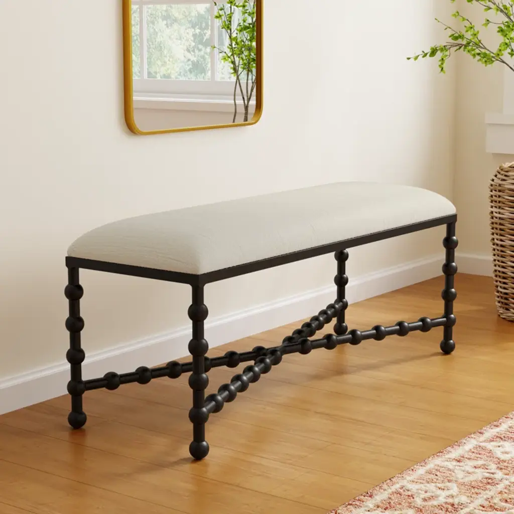 This upholstered bench is such a versatile, eye-catching addition to your home furnishings collection. It has an iron frame in a black finish that contrasts nicely with the white upholstery wrapping around the cushioned seat. Place alongside your dining room table, in the hall – a place to tie up your shoes before you head out the door – or at the foot of your bed topped with a couple folded quilts.