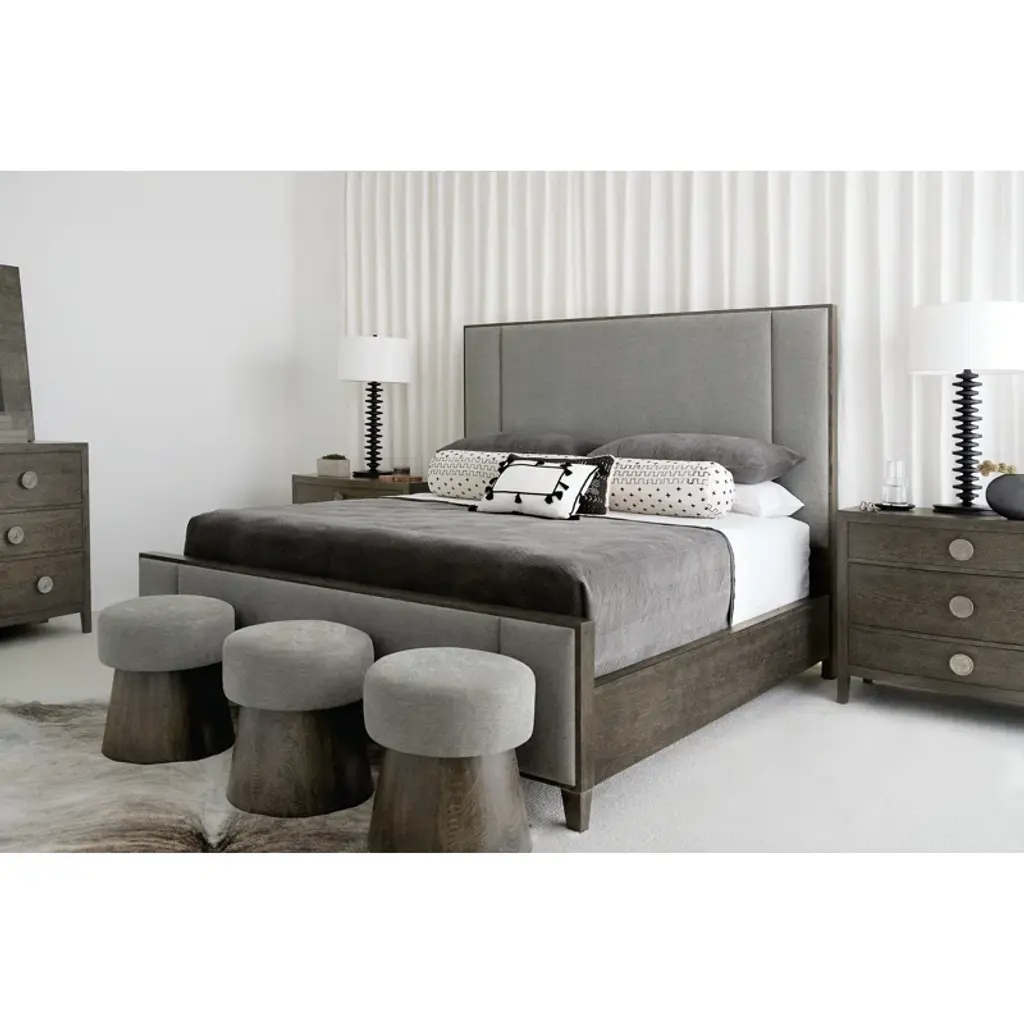 The Casa Paros bench's A-framed base is formed by two side panels and a dowel stretcher. The wooden base in Playa finish supports an upholstered seat to provide both form and function.
