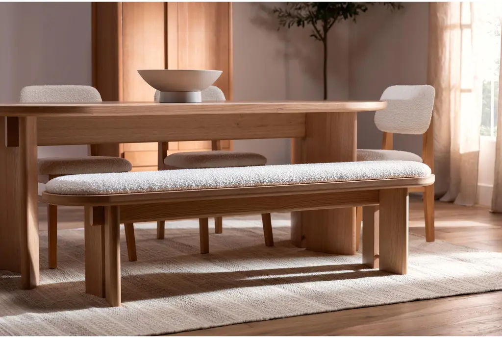 Introducing the Catania Natural Modern Oak 70" Oval Dining Bench, a versatile piece perfect for your dining room or entryway. The Scandinavian-inspired design combines natural wood tones with contemporary curves, creating a stylish and functional seating option.
