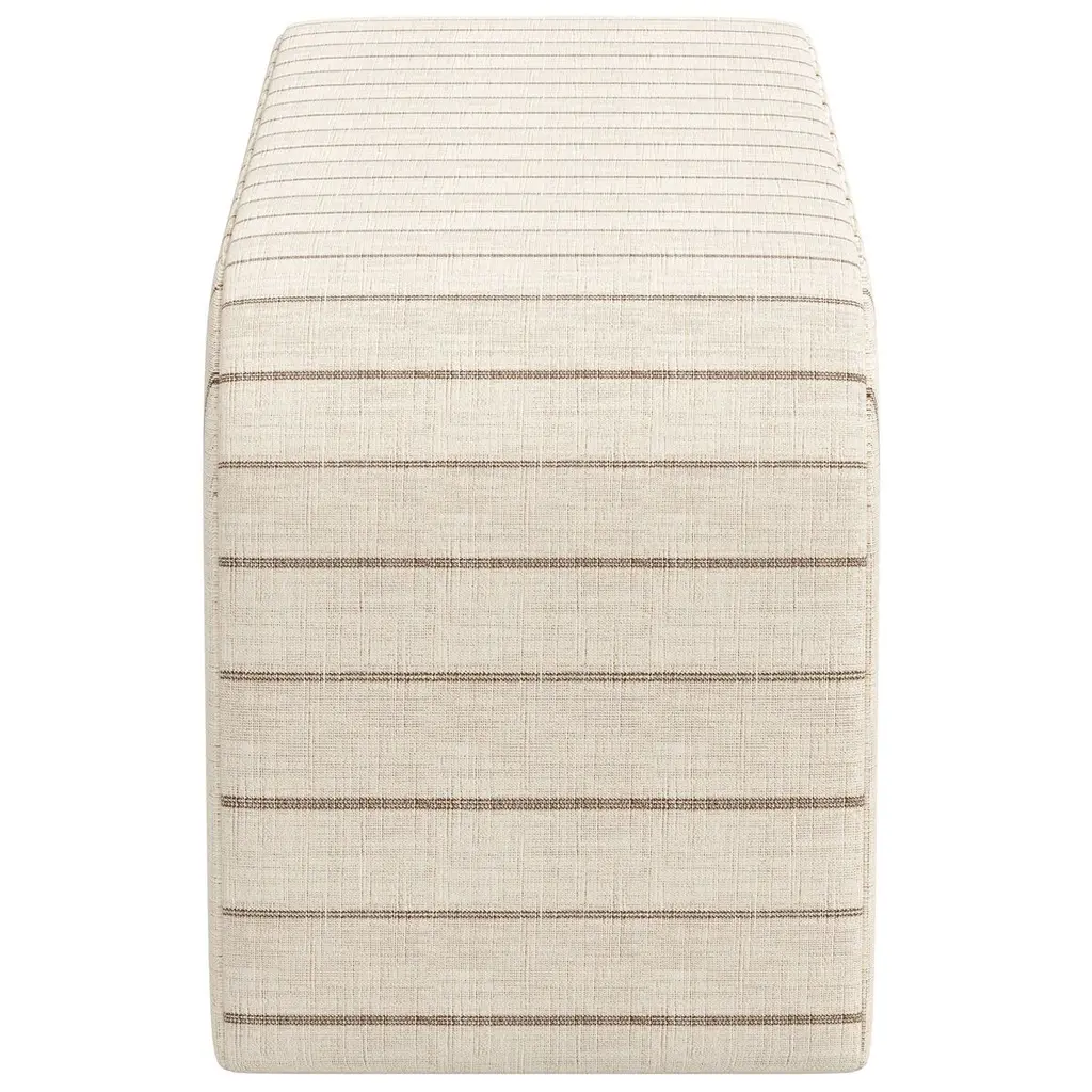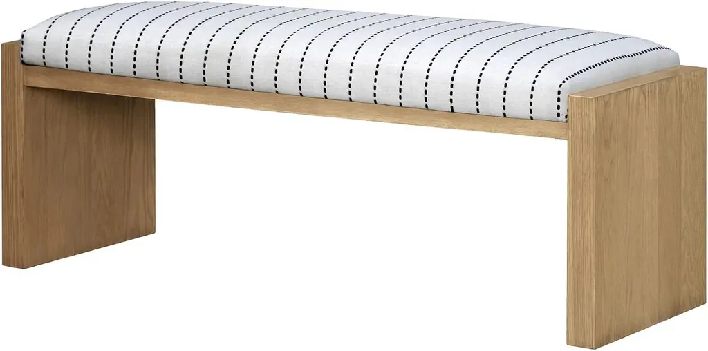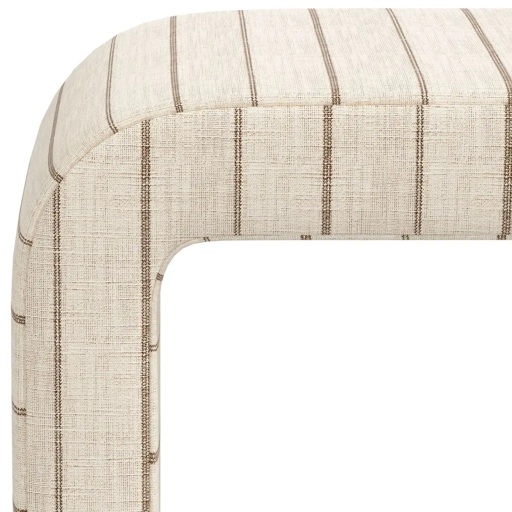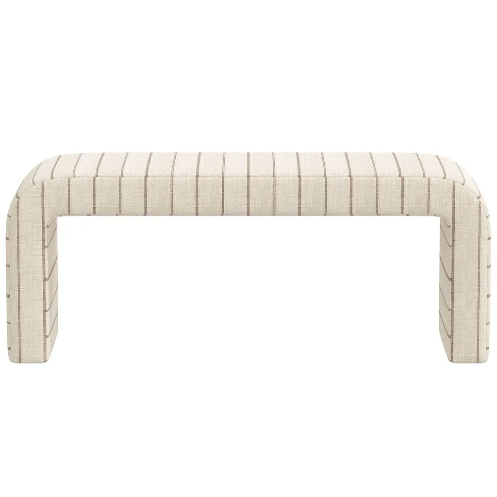Made in the USA, this bench features rounded corners for a fresh contemporary vibe. Completely hand upholstered in a stunning striped cotton-linen-blend fabric, it excudes charm and sophistication. Whether you place it at the foot of your bed, beneath a window, or alongside your dining table, it will bring panache to its surroundings.