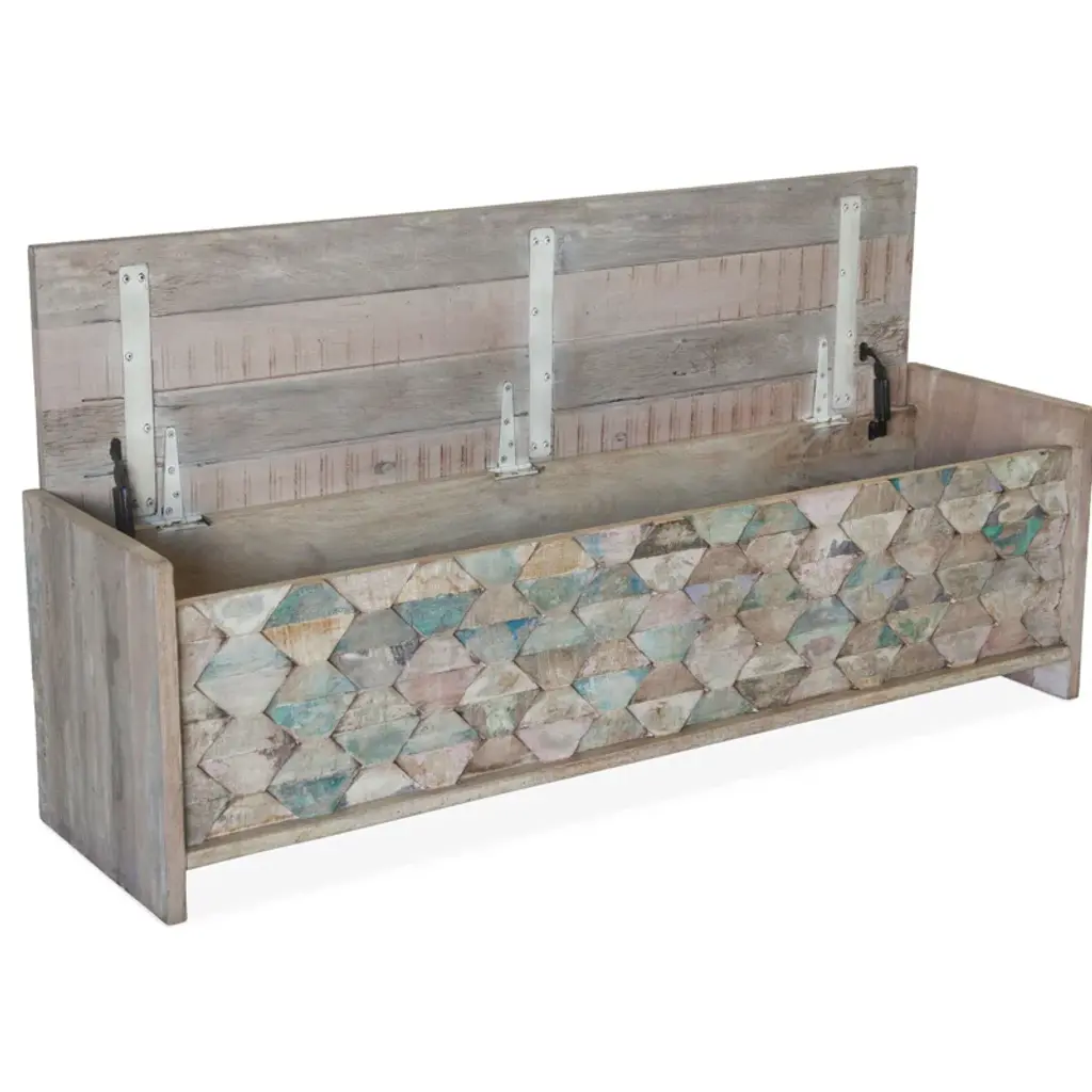 Reclaimed teak wood in an airy pastel finish exudes a casual, coastal charm in the pieces of the Cordoba collection. Each piece radiates a whimsical feeling that is both artful and wholly unique, combining hand-carved accents in a mixture of modern and vintage styles. This hand-crafted dining bench is fashioned from reclaimed teak wood with a vintage teal finish on the wood that offers durability while showcasing the natural grain and beauty of the wood. Across the front of the bench is a unique, geometric design of hexagon-shaped pieces of teak wood that fit together in a simple yet intricate pattern. The bench's seat rests 18-inches from the floor at the perfect dining height, and features a storage space within the body beneath the hinged seat that runs the entire length of the piece. With its hidden storage area, this bench is the perfect functional piece for accompanying a smaller more casual kitchen space or for adorning a foyer. This bench is pre-assembled, and with eco-friendly materials of the finest quality, it will be an effortless addition to any home.