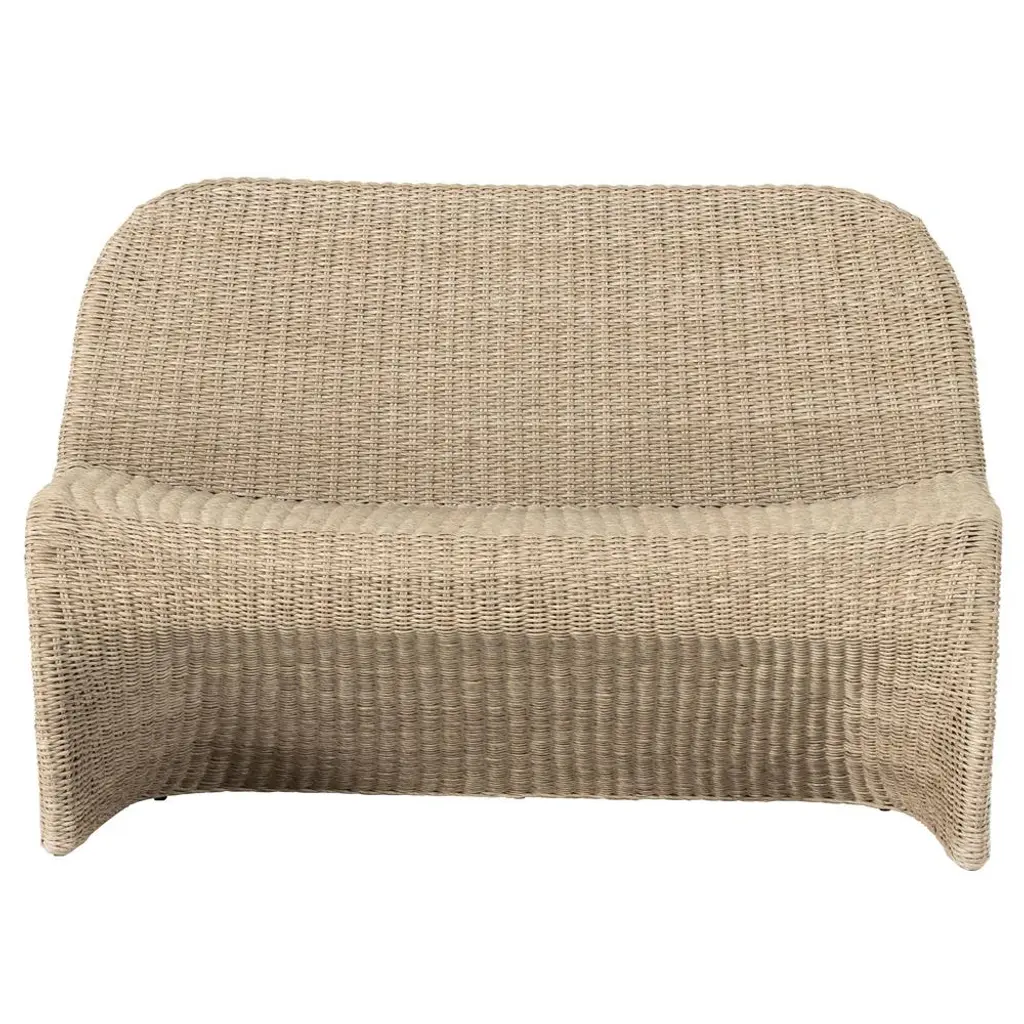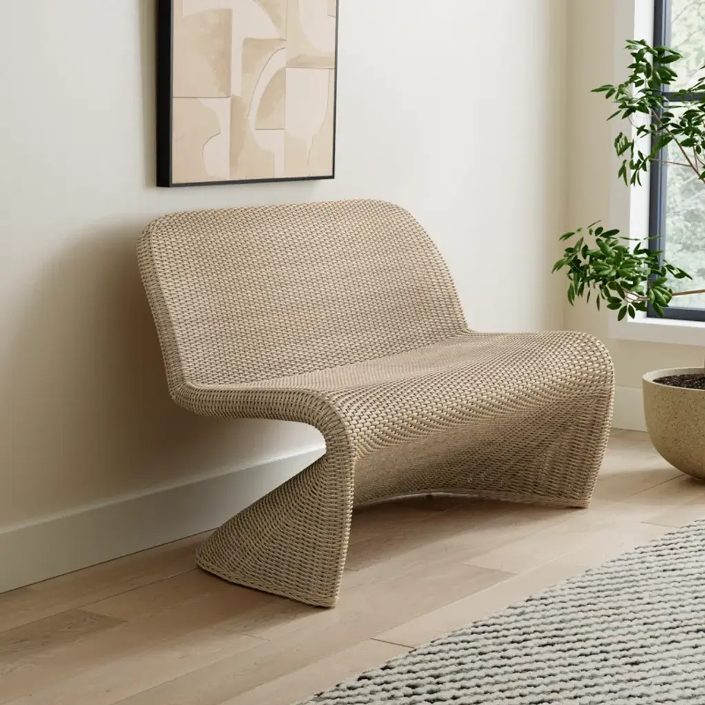 Dynamic curves. Our dining bench boasts a single, fluid shape with smooth contours for a balanced and comfortable seating experience. Crafted from wicker rattan, the minimalist design adds a breezy, mod-inspired vibe to your outdoor space. Plus, it's sized to accommodate two people for basking in the sun or enjoying quiet conversation.