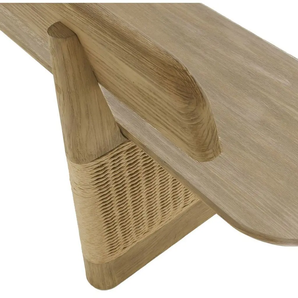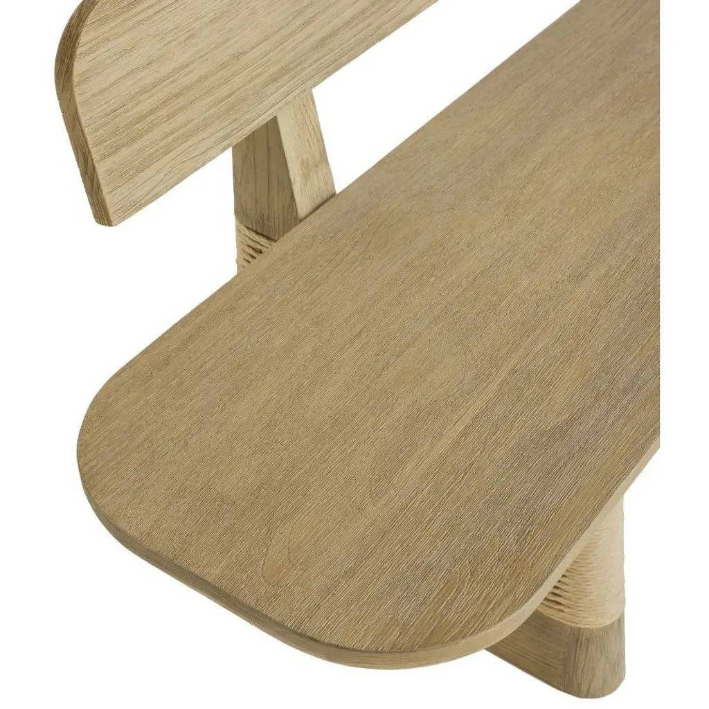 The low-slung companion to our Delrio dining table, this teak wood bench is the perfect synthesis between Japanese and Southwestern style. Stained in a rich honey hue, its supportive back and seat possess expansive planes to cradle the body. Matching honey synthetic rope wraps each keenly angled leg. A notched detail where the back meets the base allows it to float within any outdoor seating area. Finish will vary.
