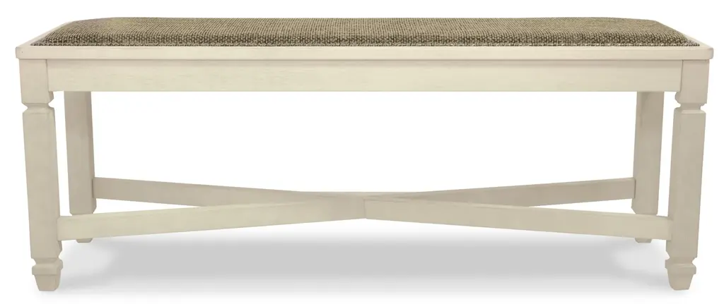 The beauty of this upholstered dining bench is something to savor. Serving up comfort and flair, this generously scaled bench entices with a cushioned seat covered in a heavy woven fabric that complements the antiqued white finish.